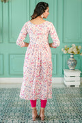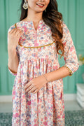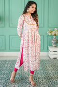 This cream-colored garment is a fusion of elegance and vibrant style. The floral print adds a touch of femininity and liveliness to the overall design. This festive kurta is designed out of a multi-coloured floral printed linen fabric having boat neck with V cut, regular three-fourth sleeves, gathers around the waist and side slits on both sides. Embellishment of florescent pink piping and multi-coloured golden lace on front yoke and sleeve round serves a bold and attention-grabbing element.