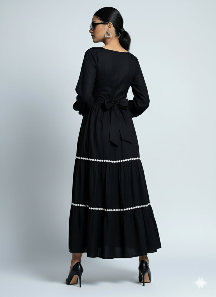 Full sleeves and a square neckline add a sophisticated and classic touch. The solid black design offers versatile styling for various occasions. Full-length silhouette creates an elegant, elongating effect.