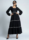 A black full-sleeve cotton blend dress with a square neckline, styled as a full-length one-piece perfect for both casual and occasional wear. The soft cotton blend fabric ensures all-day comfort and a graceful drape.