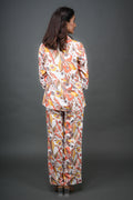 This stylish off-white co-ord set features a ¾ sleeve shirt with a collar neck and a floral abstract print, paired with a mustard inner and a square neck. The matching white palazzo pants also showcase the same print and come with a half-belt, half-elastic waistband for a comfortable fit. Perfect for both office and occasional wear.
