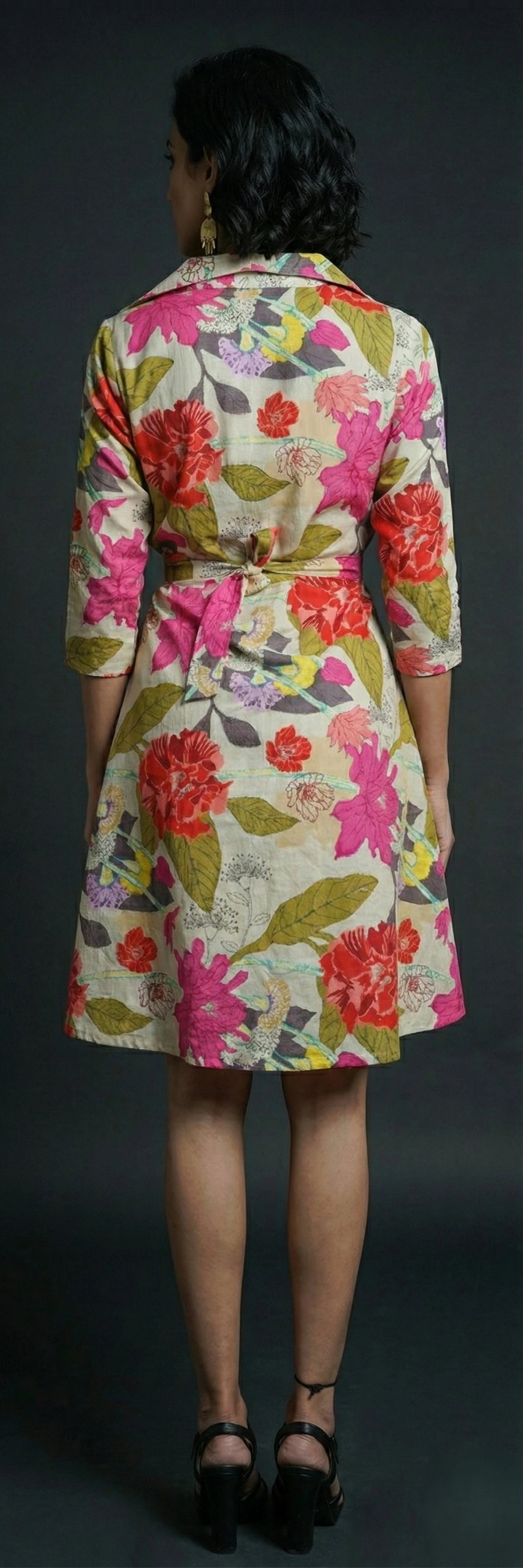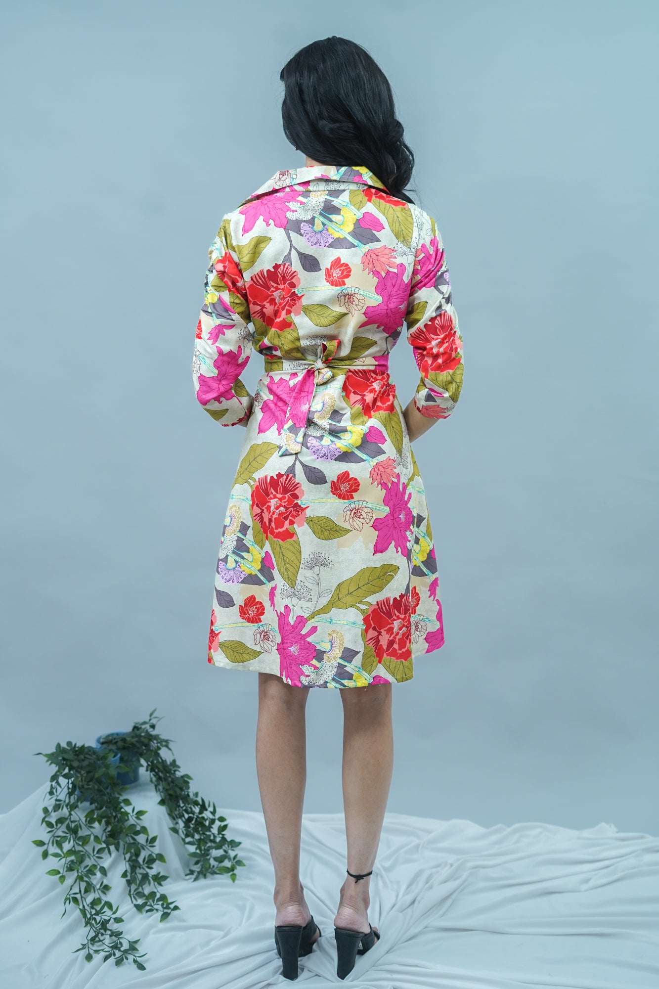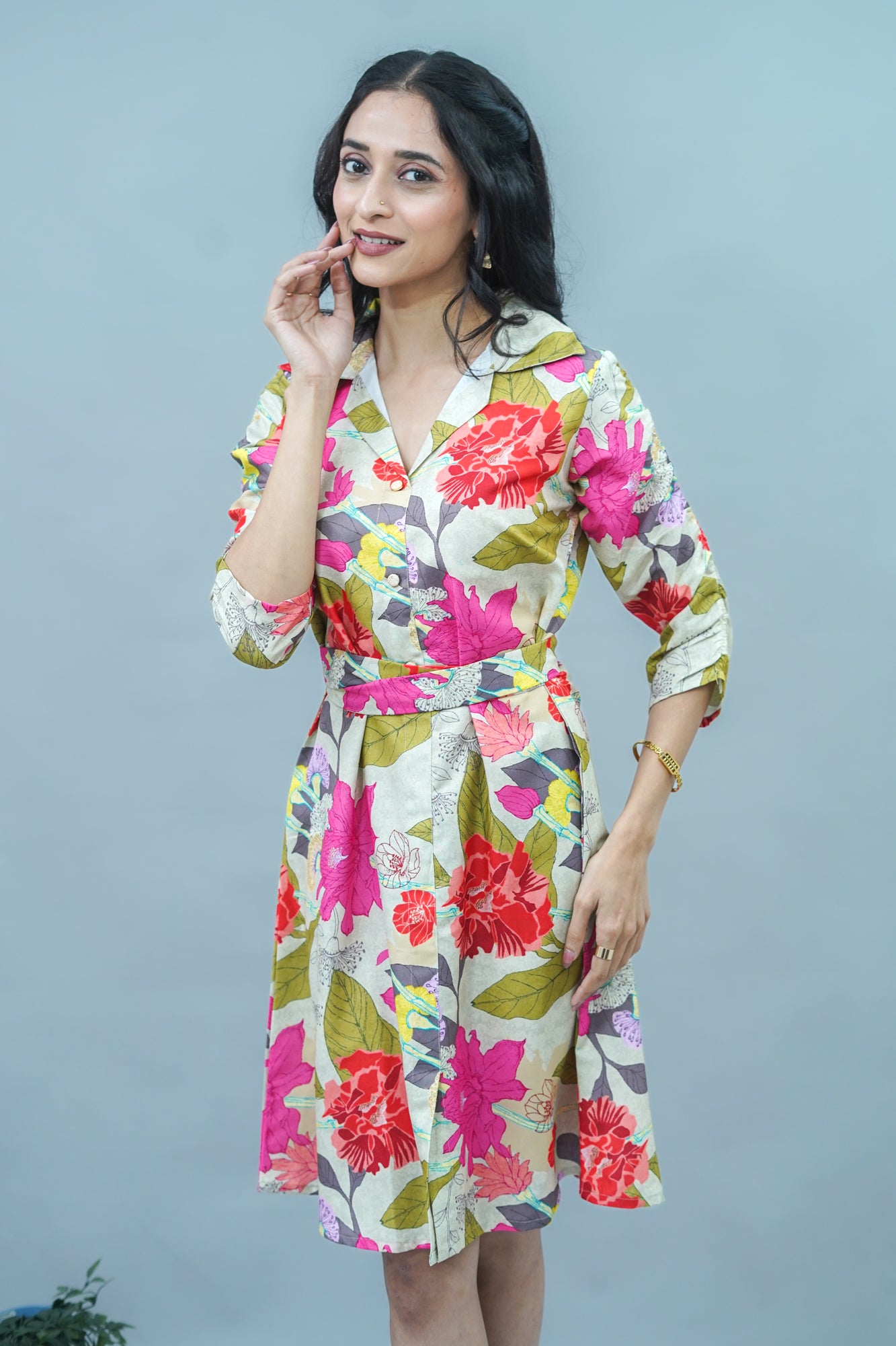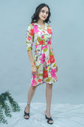 Designed with a flattering V-neck and elbow-length elastic sleeves, this dress offers both comfort and style. The vibrant floral print, crafted in Cotton Blend digital print fabric, ensures a fresh and chic look. The above-knee length adds a playful and flattering touch, perfect for both occasional and regular wear.