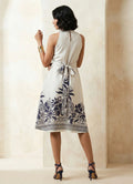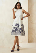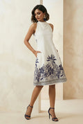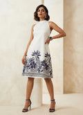 This elegant off-white dress features a sleeveless design with a close collar neck, perfect for a polished look. The dress is adorned with a delicate floral placement print on Cotton Blend fabric, designed for gentle machine wash care. With an above-knee length, this one-piece dress combines comfort and style, making it suitable for both occasional and regular wear.