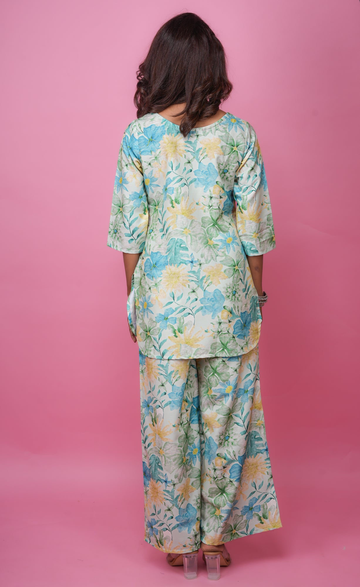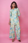 The coordinating full-length bottoms in matching pale lime green also showcase the same floral print, designed with a half-belt, half-elastic waistband for a comfortable, adjustable fit. This set is ideal for a chic, relaxed look that transitions effortlessly from day to evening.