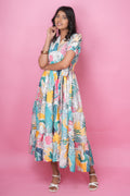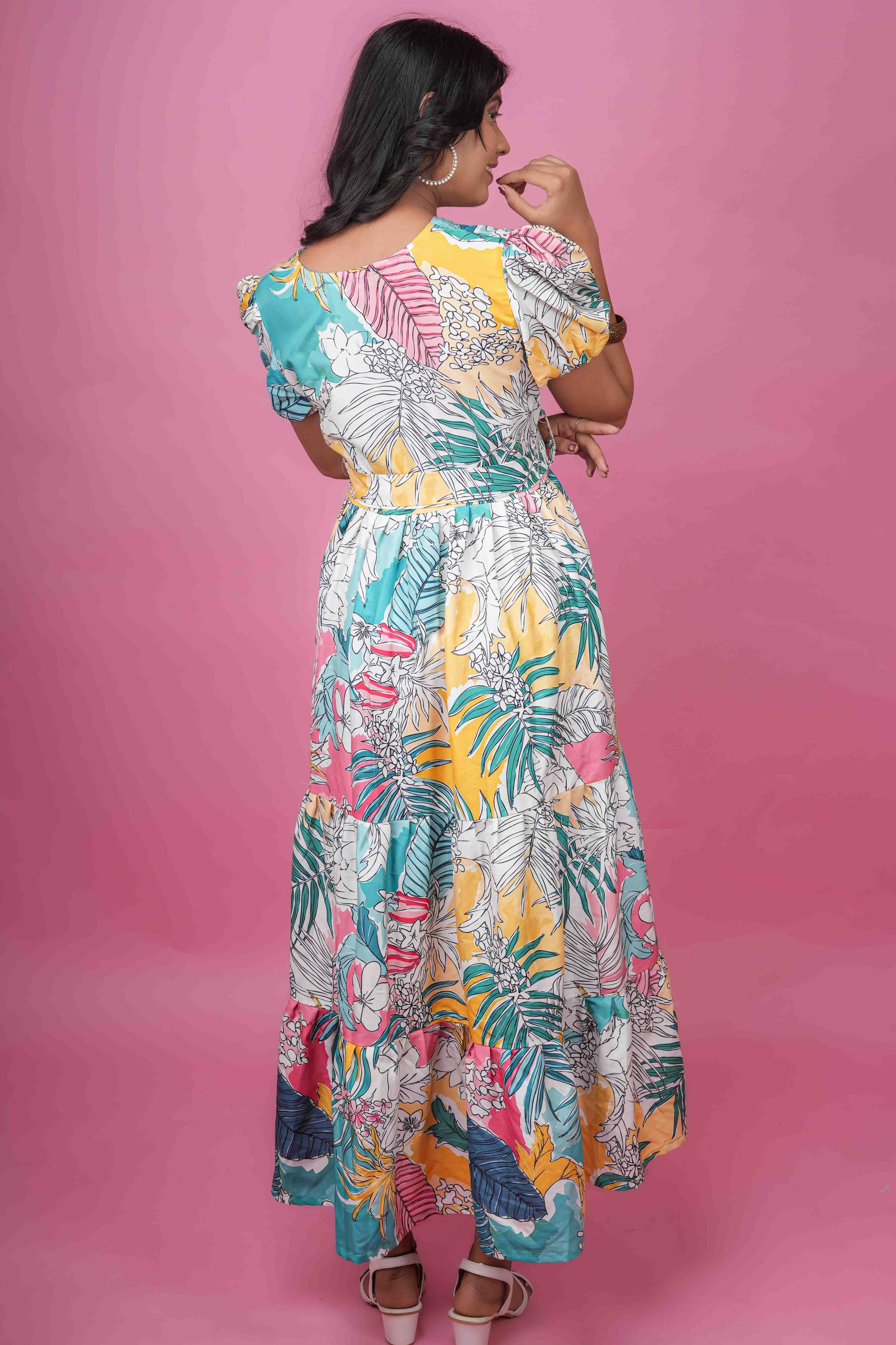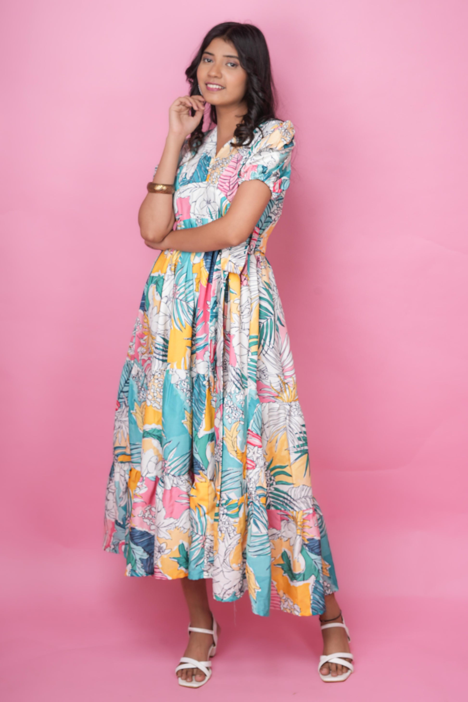 In a stunning mint sky blue shade, this dress radiates breezy elegance, beautifully adorned with a chic floral abstract print that screams modern romance. The stylish V-neckline and cute puff sleeves bring a playful yet sophisticated vibe, while the ankle-length silhouette adds graceful flow to every step.