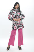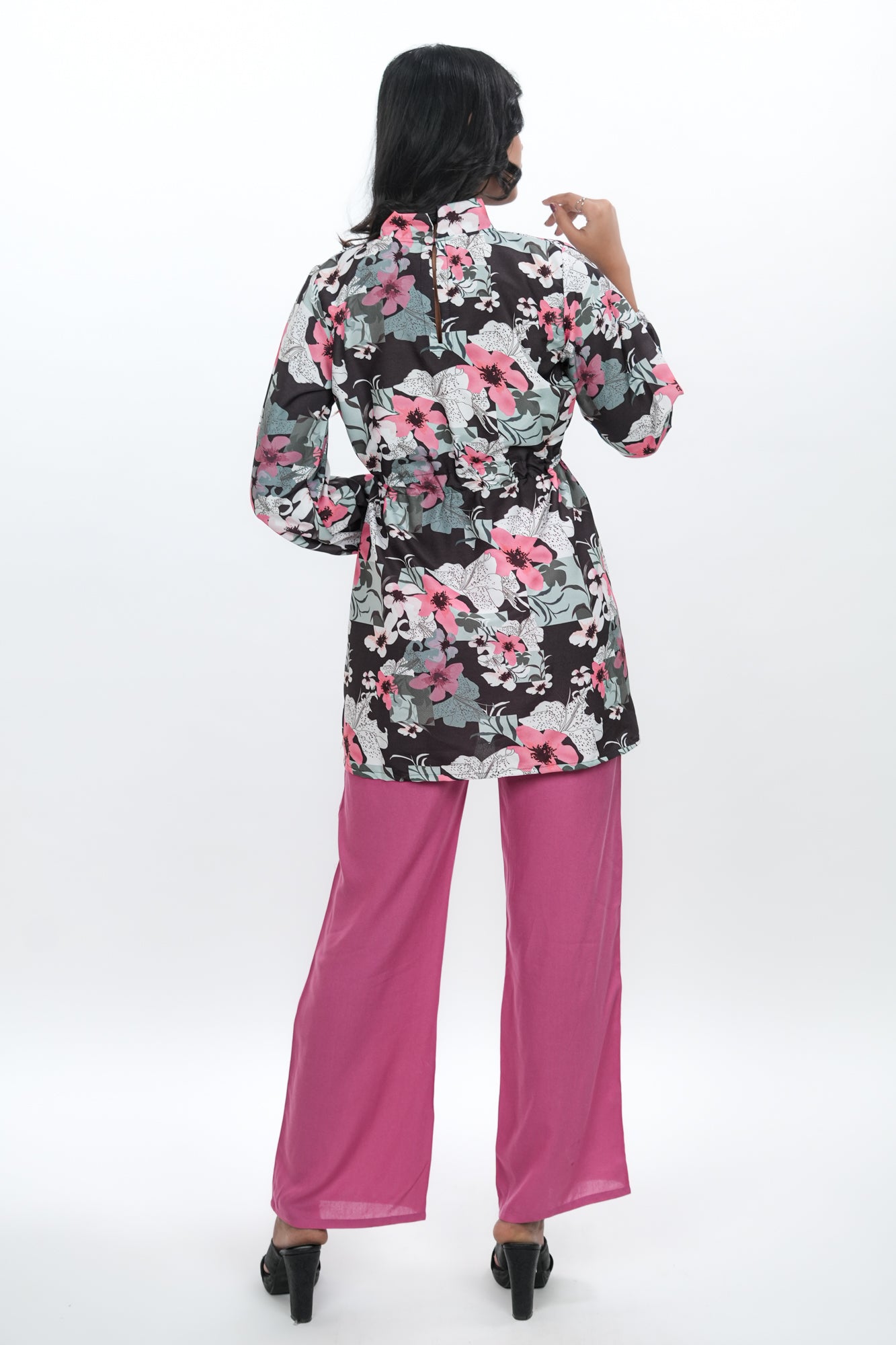 This elegant black floral print co-ord set is perfect for both office and occasional wear. The ¾ sleeve top features gathered detailing at the sleeves, a stylish turtle neck, and a bold floral print crafted from soft cotton blend digital fabric. The above-knee length top pairs beautifully with cyclamen pink full-length pants, offering a striking contrast. The pants are designed with a half belt, half elastic waistband for a comfortable and flattering fit, making this set an ideal choice for a chic and sophisticated look.