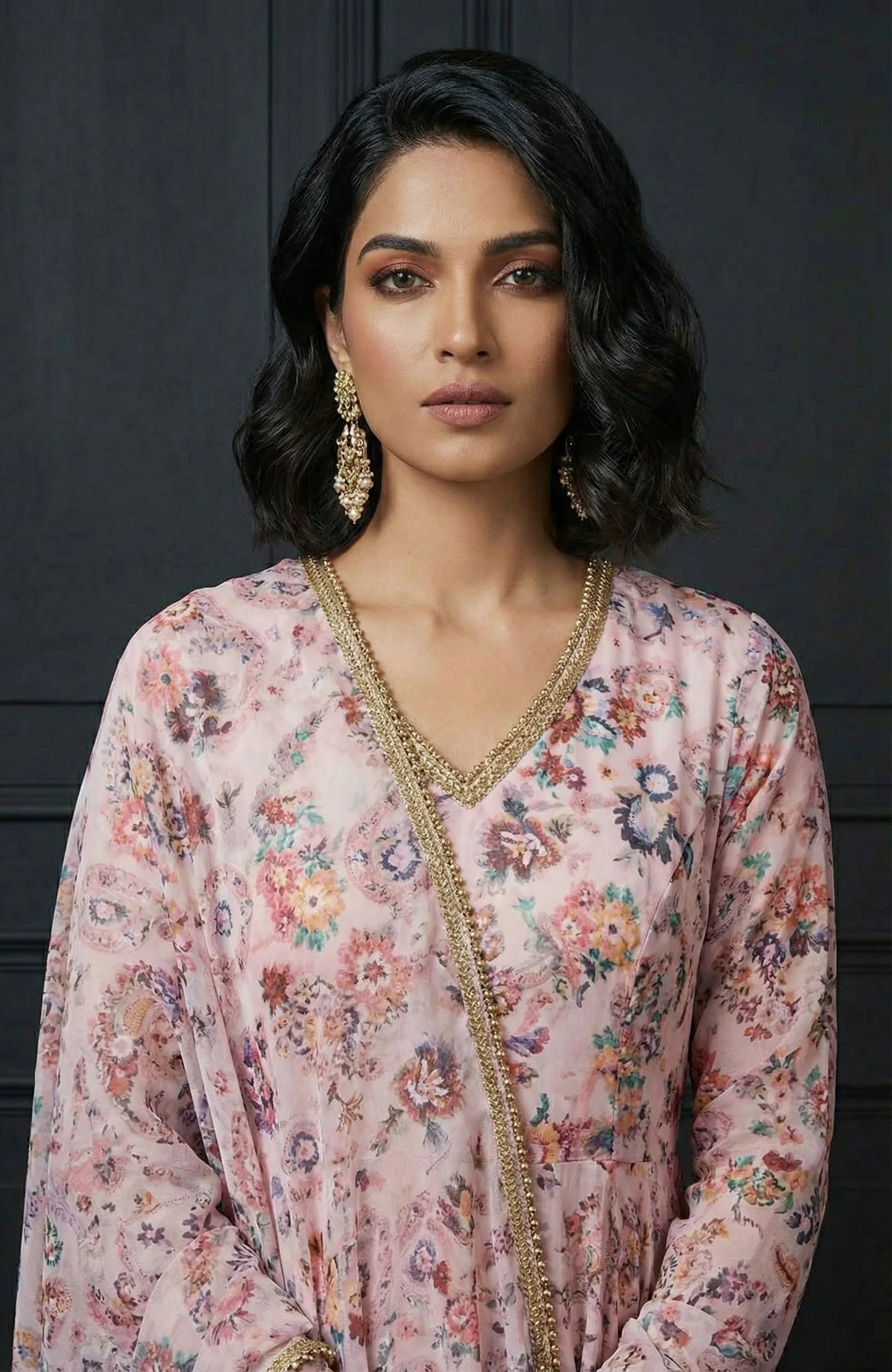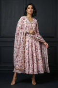 Introducing our Silhouette ensemble: a stunning Anarkali paired with pants, perfect for festive occasions. Crafted from luxurious Georgette fabric in a soft baby pink hue, the Anarkali features full plain sleeves and a flattering V-neck, exuding grace. Adorned with a beautiful floral paisley print, the Anarkali adds elegance to your festive look. To elevate the ensemble, it is adorned with multicolor sequence lace, adding a touch of glamour and sophistication. Complete with full-length pants and a matching floral paisley printed organza dupatta, this ensemble promises both style and comfort for your festive celebrations.