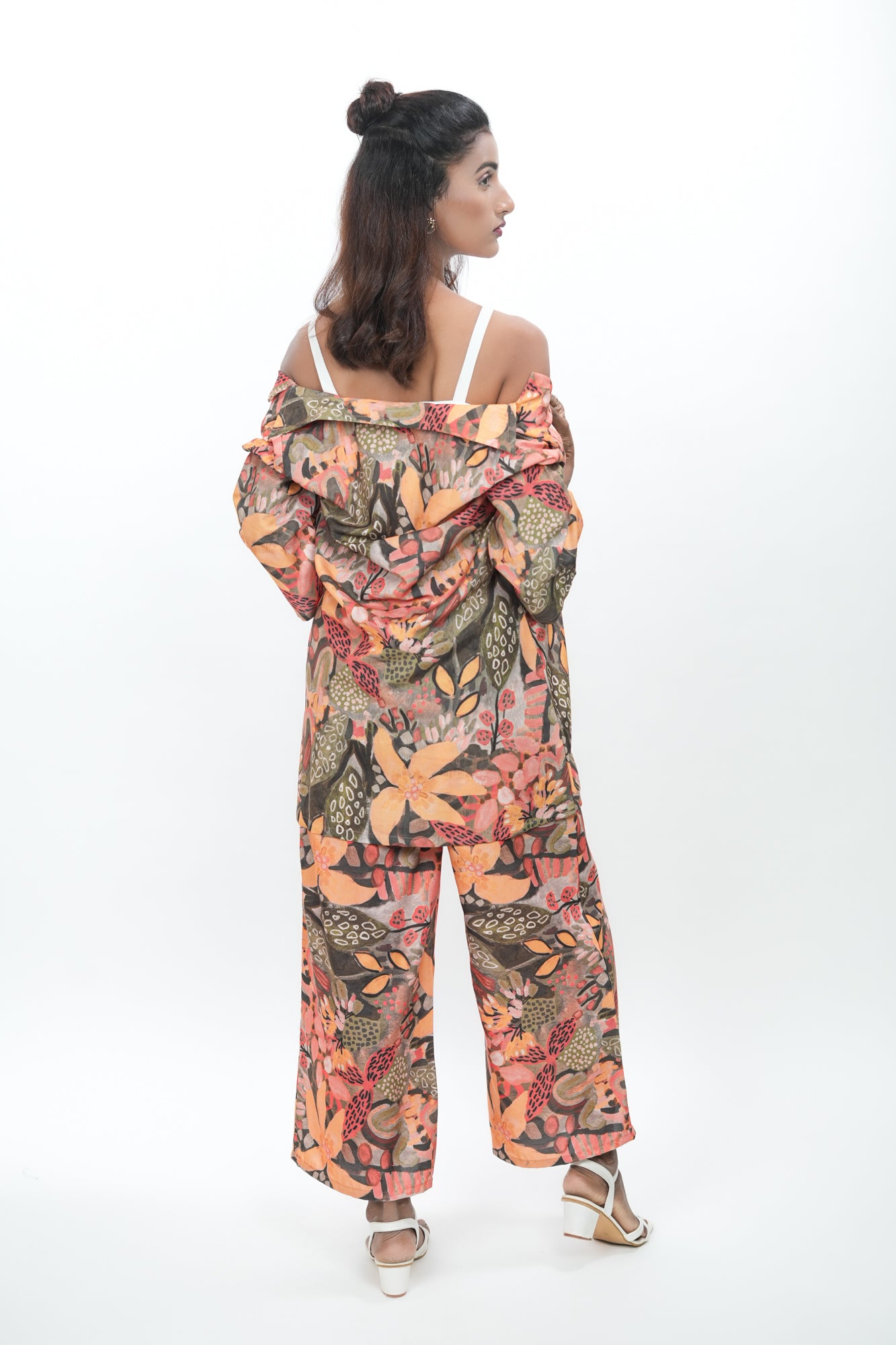 The matching full-length bottoms feature the same forest print, with a half belt, half elastic waistband for a comfortable fit. A perfect blend of nature-inspired design and everyday comfort.