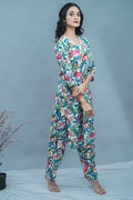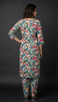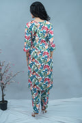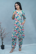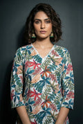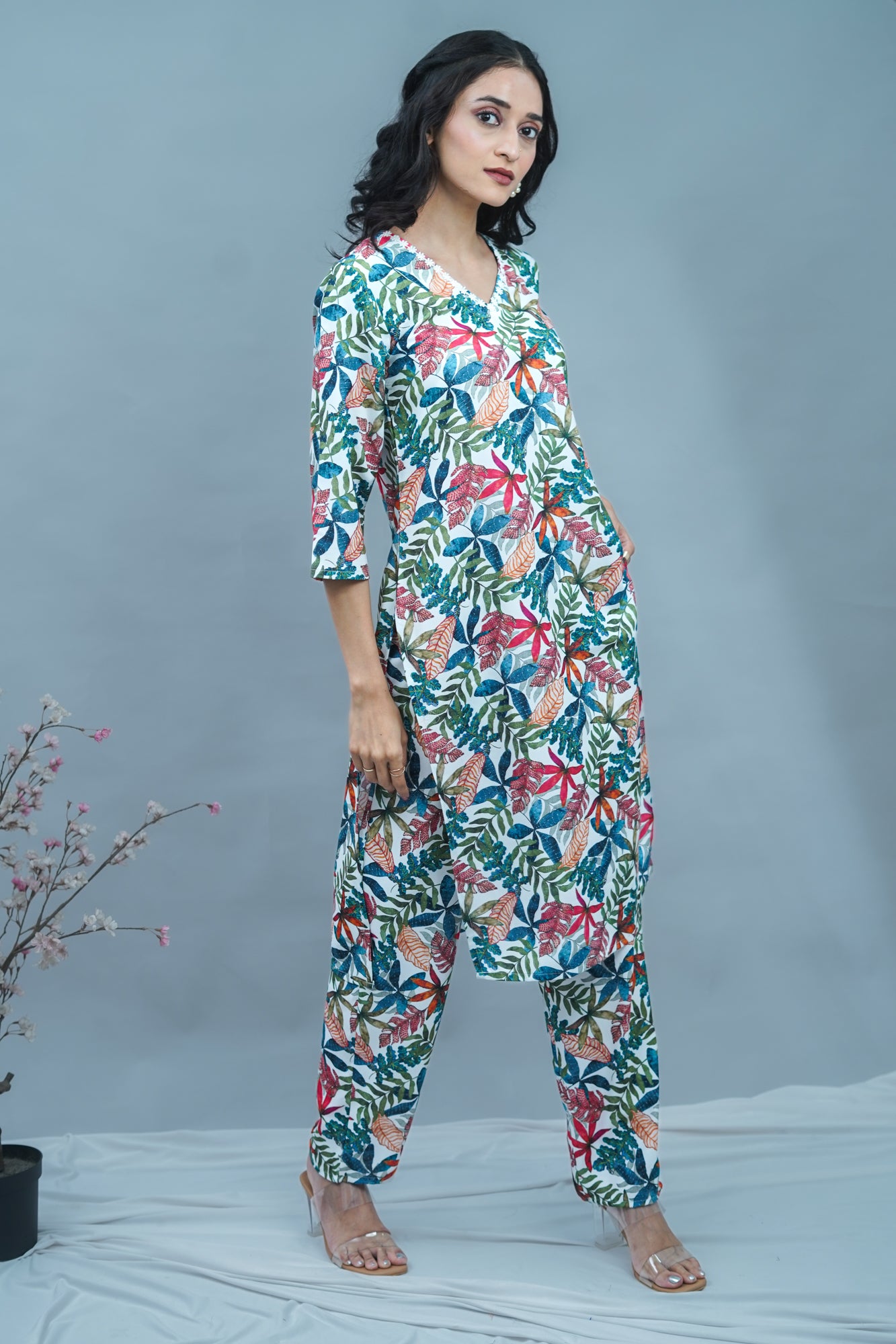 The knee-length top features a V-neck, plain ¾ sleeves, and a beautiful forest-inspired print that exudes sophistication. Paired with full-length bottoms, designed with a half-belt and half-elastic waistband for a comfortable fit, this set combines grace with ease.