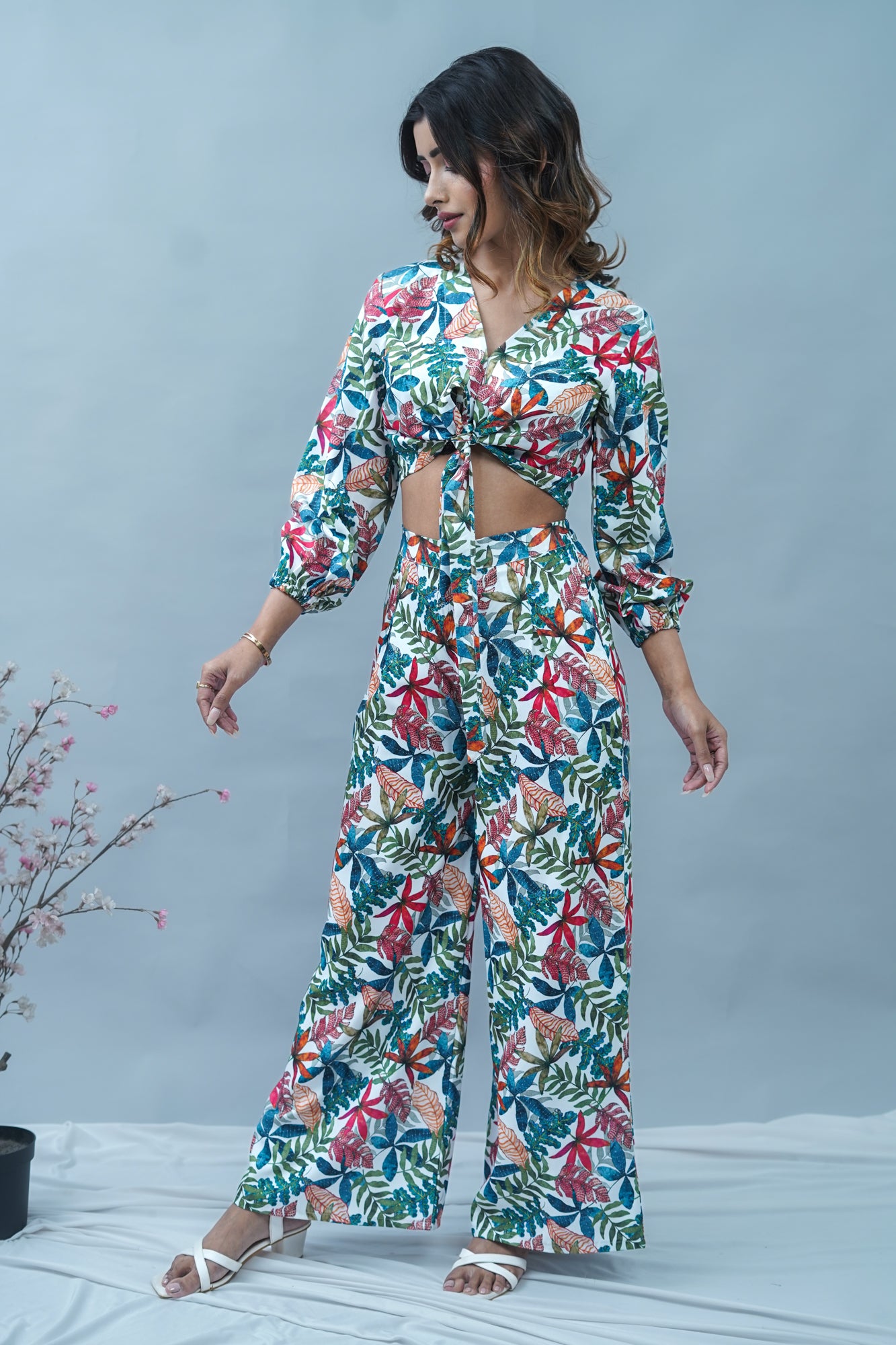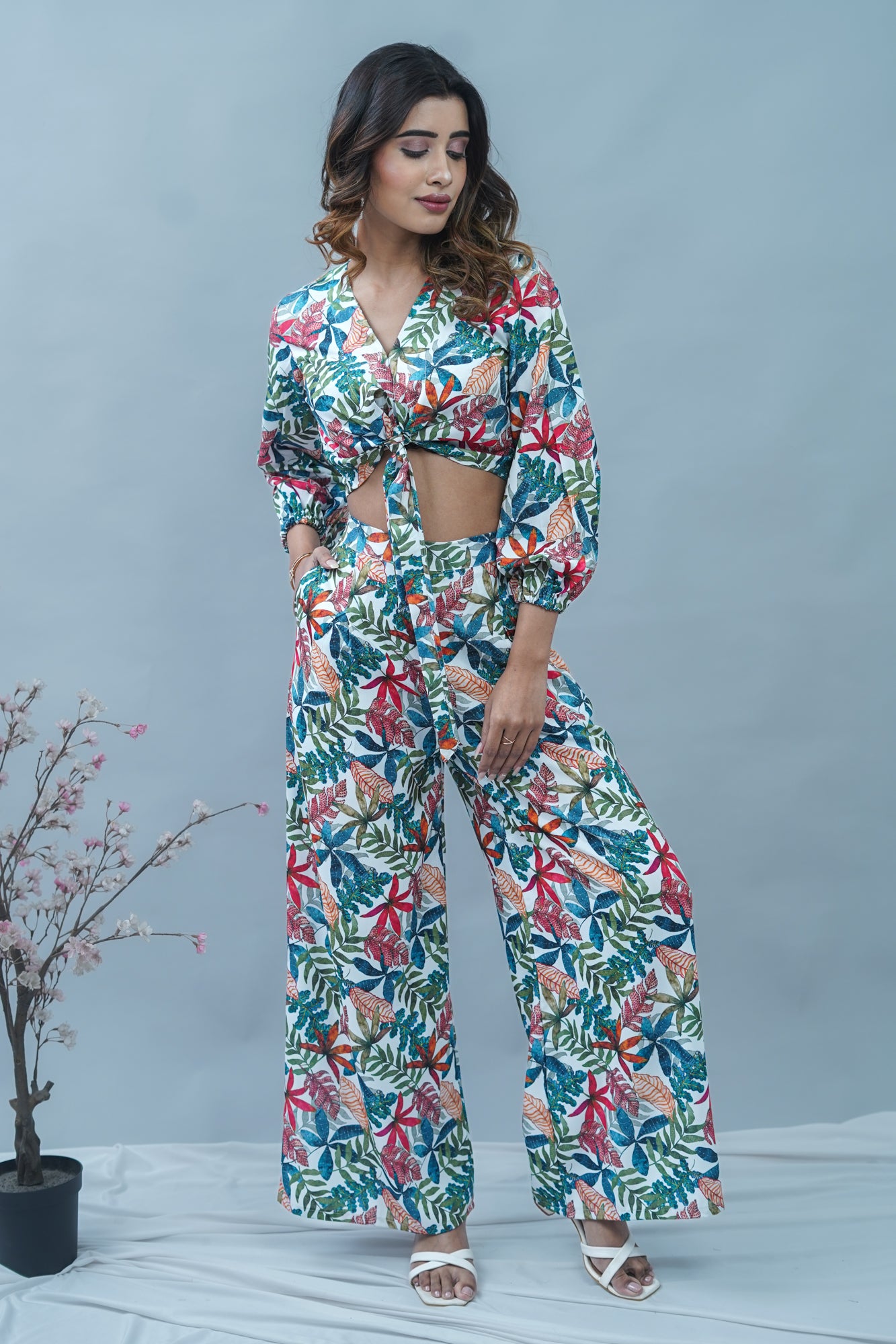 Add a refreshing touch to your wardrobe with this elegant white forest print co-ord set, perfect for both casual and occasional wear.