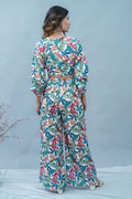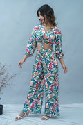 The knot-style crop top features a flattering V-neck, puffed ¾ sleeves, and a unique forest-inspired print, making it a standout choice. Paired with full-length bottoms, designed with a half-belt and half-elastic waistband, this set offers a blend of style and comfort.