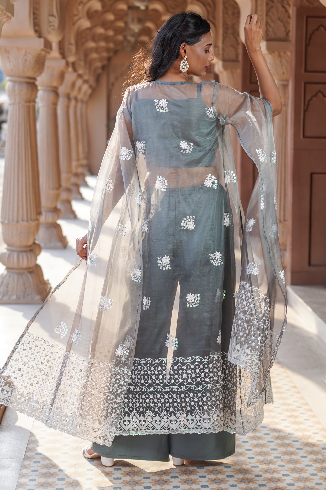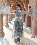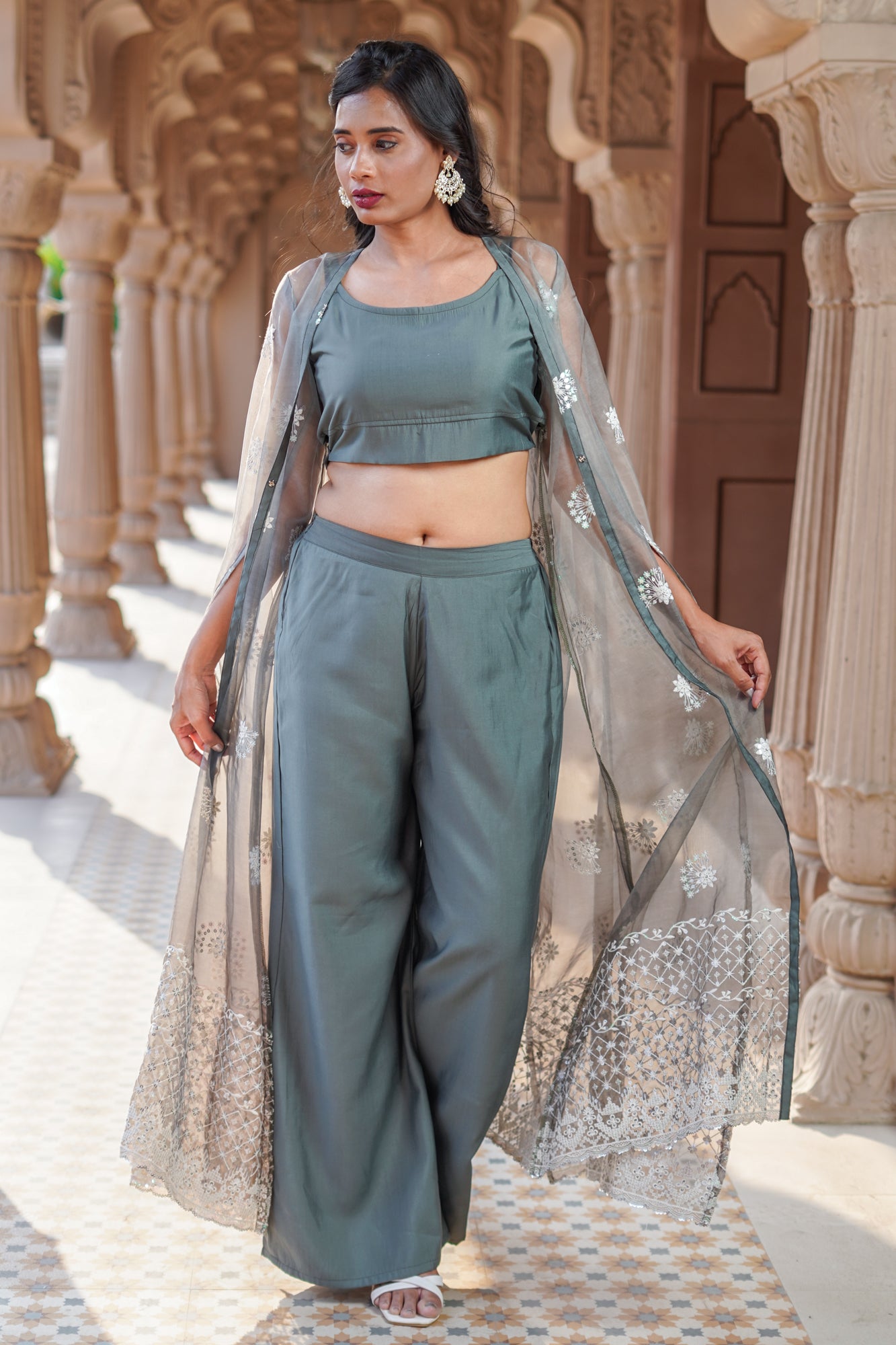 Paired with flowing palazzo pants and a stylish crop top, this ensemble offers both elegance and modern charm. Perfect for a variety of occasions, it's sure to make a statement wherever you go.