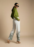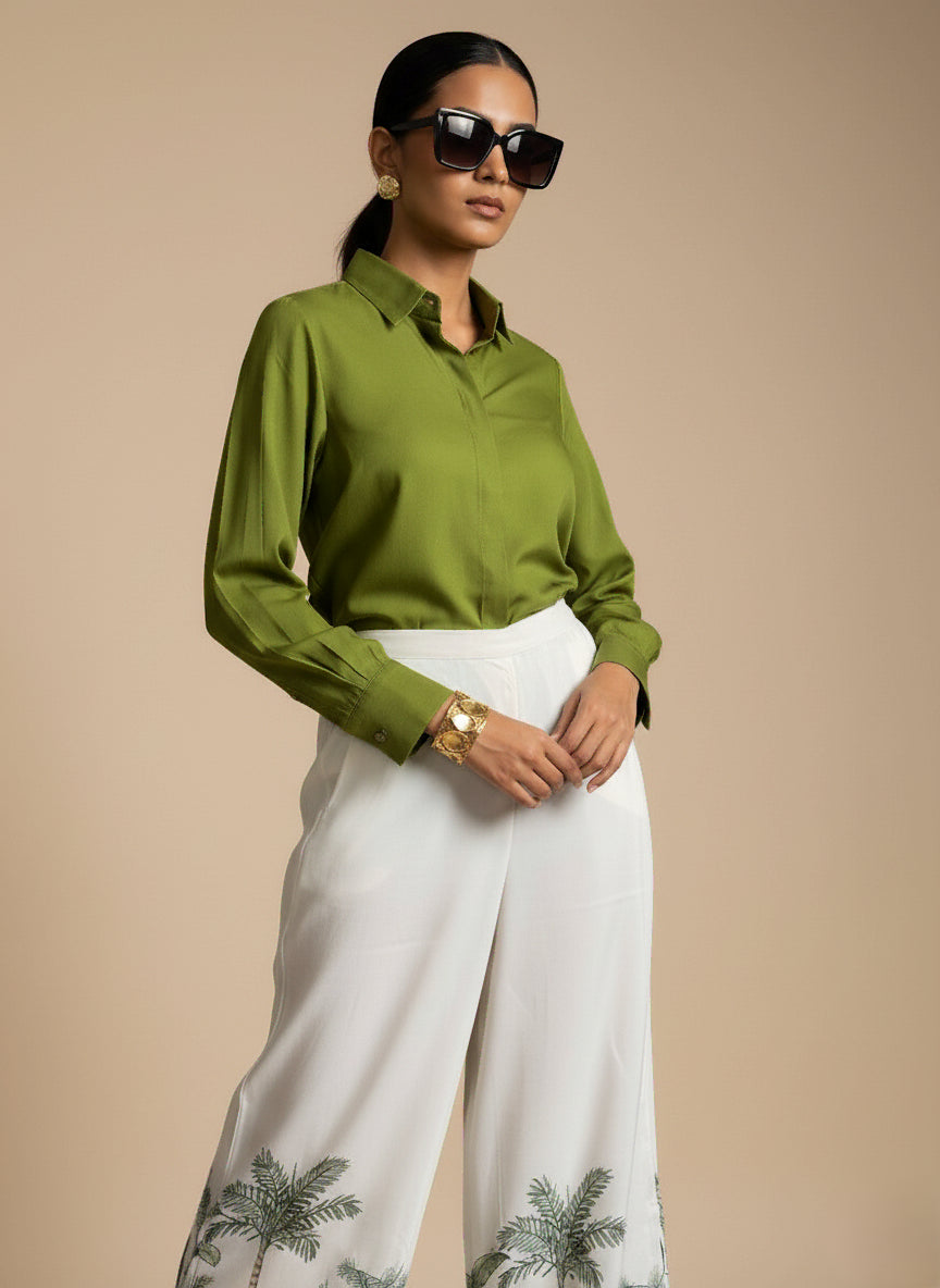 A green, full-sleeve cotton blend collar shirt paired with ivory forest-print palazzo pants, styled for a chic, comfortable look suitable for both regular and occasional wear.