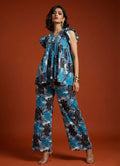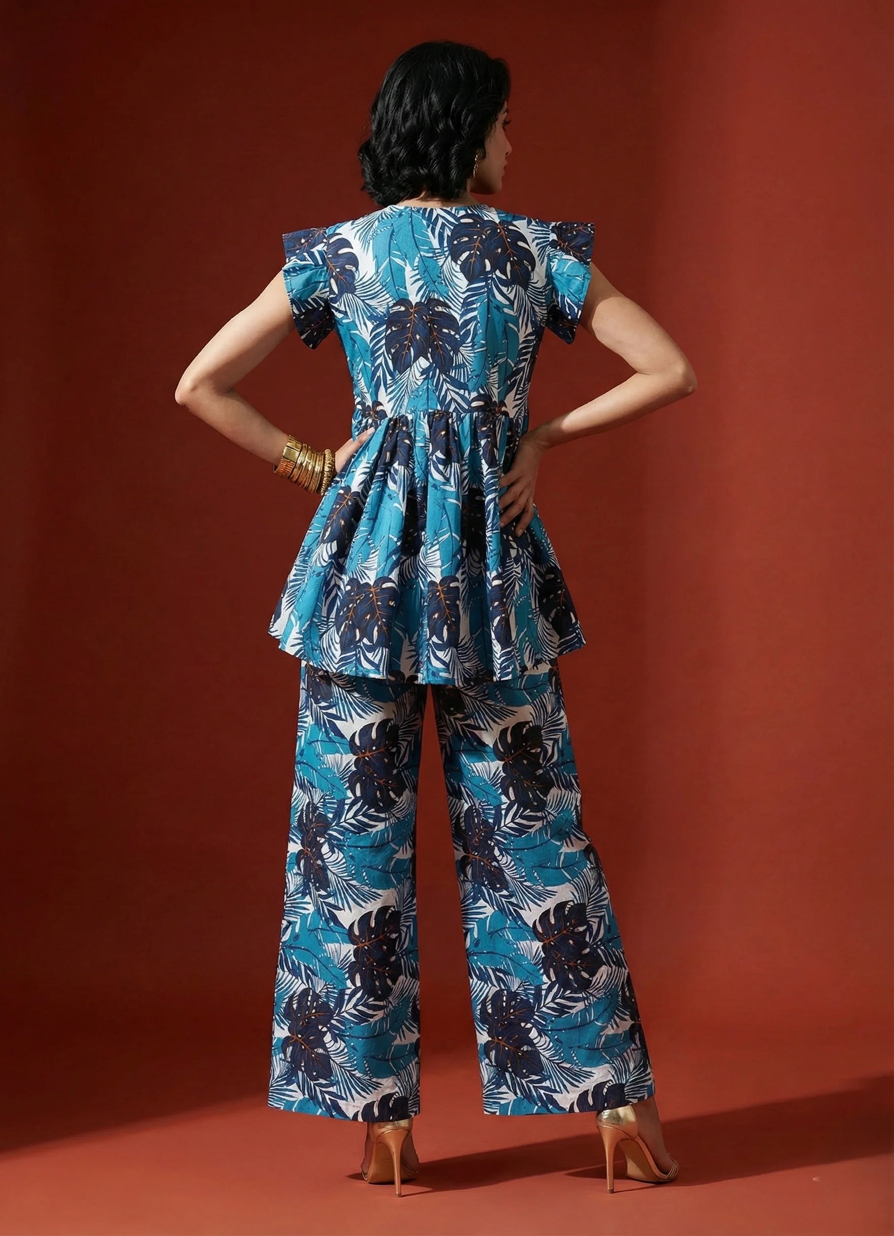 Elevate your style with this beautiful blue peplum top and bottom set! The top features a flattering V-neckline, short frill sleeves, and a stunning leaf print that adds a touch of whimsy. Made from soft Cotton Blend digital print fabric, it's perfect for casual and dressy occasions alike.