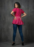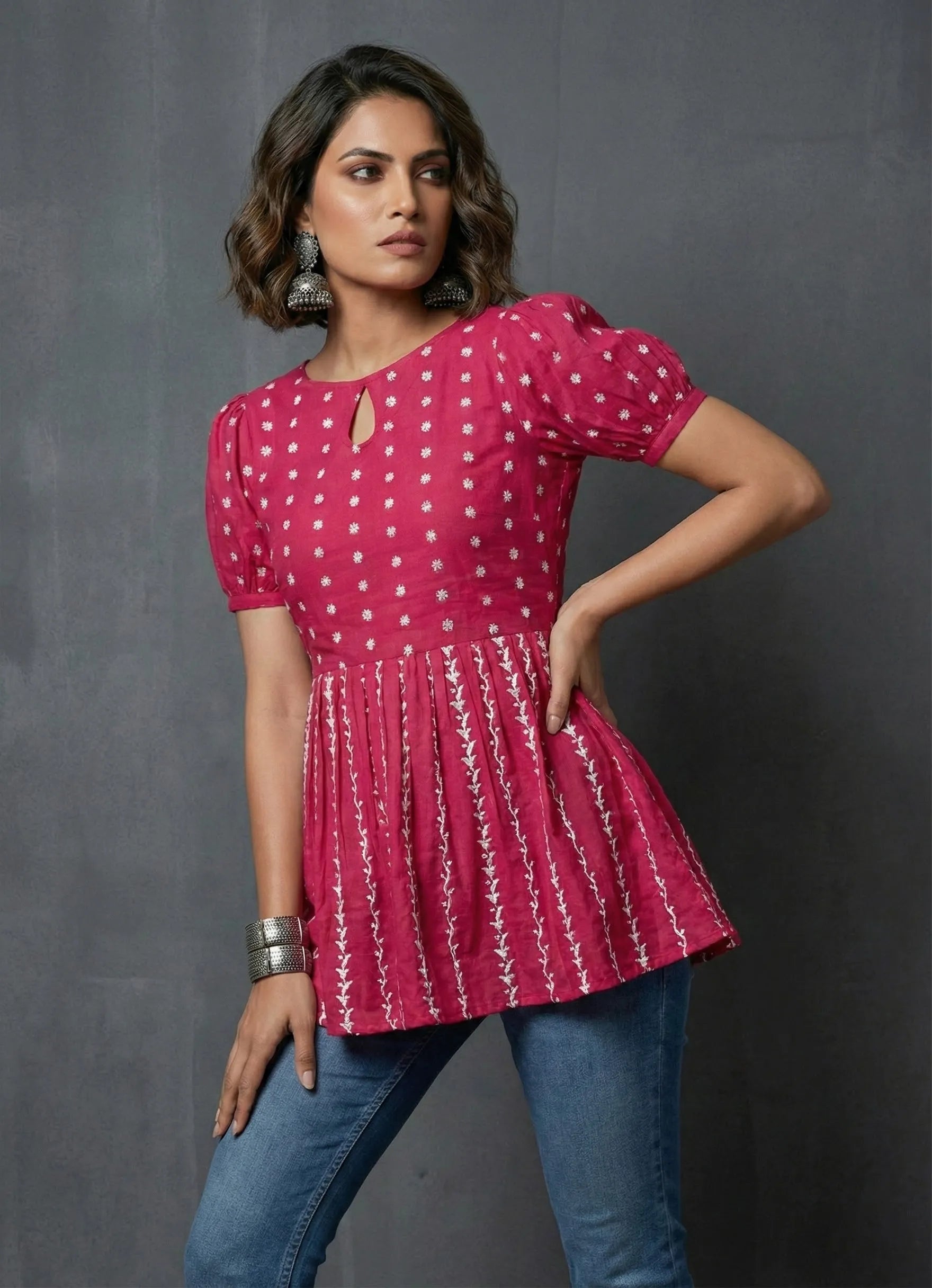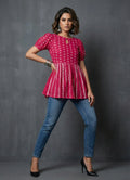 This Fuchsia Rose top is a beautiful and eye-catching piece that's perfect for adding a pop of color to your collection. Crafted out from chikankari cotton blended fabric gives it a delicate look. This top has a a boat neck with keyhoke pattern, short balloon sleeves and its length is below hip.