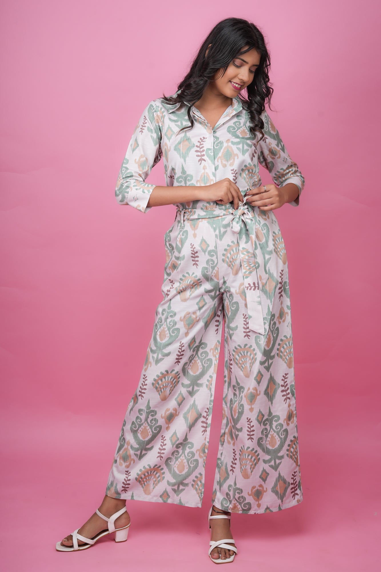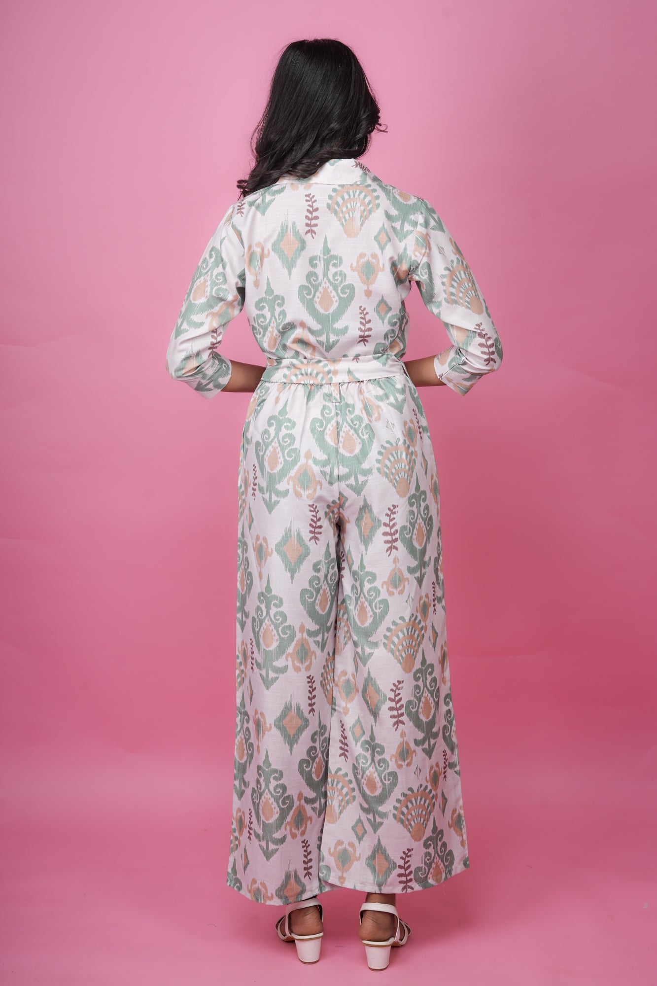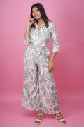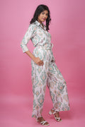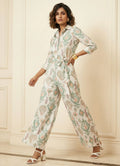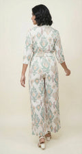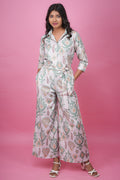 The matching beige bottoms, adorned with the same geometric print, are designed with a half-belt, half-elastic waistband for a flattering and comfortable fit that extends to full length. This set effortlessly combines contemporary elegance with versatile wearability.