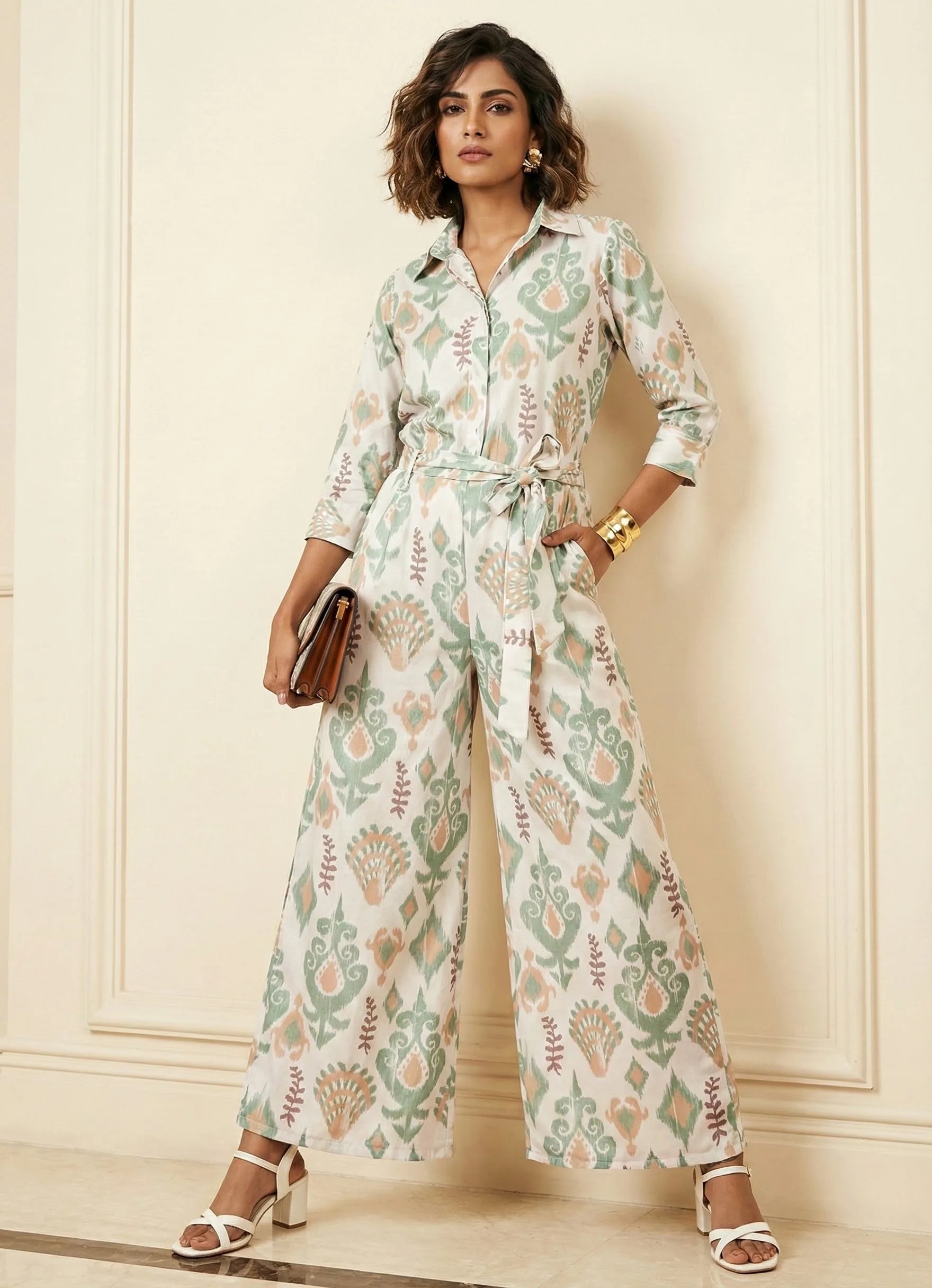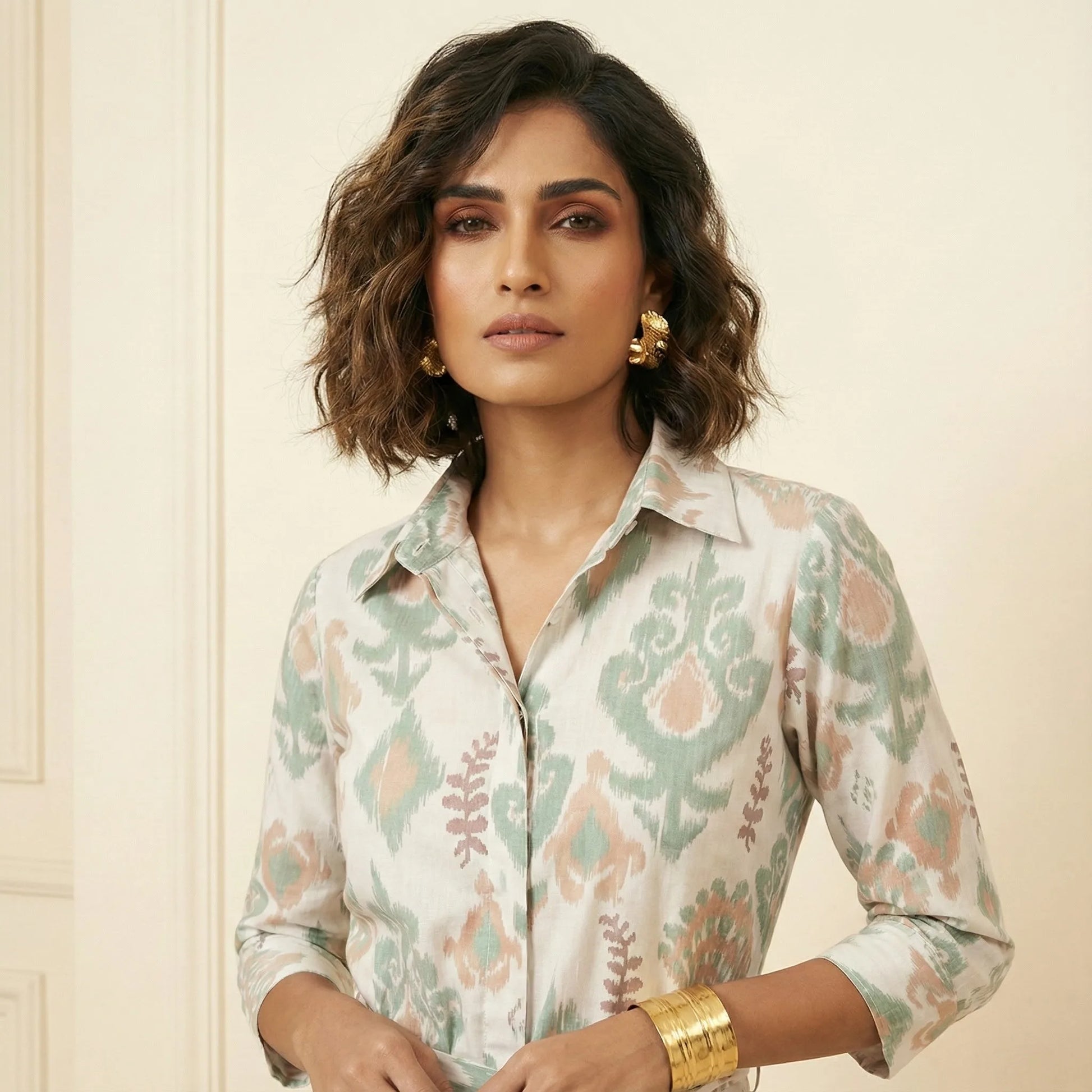 This beige co-ord set is the perfect blend of style and comfort for both office and occasional wear. The waist-length top features ¾ cuffed sleeves and a classic collar neck, complemented by a sophisticated geometric print for a modern and structured look.