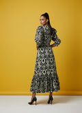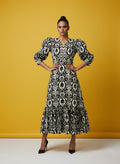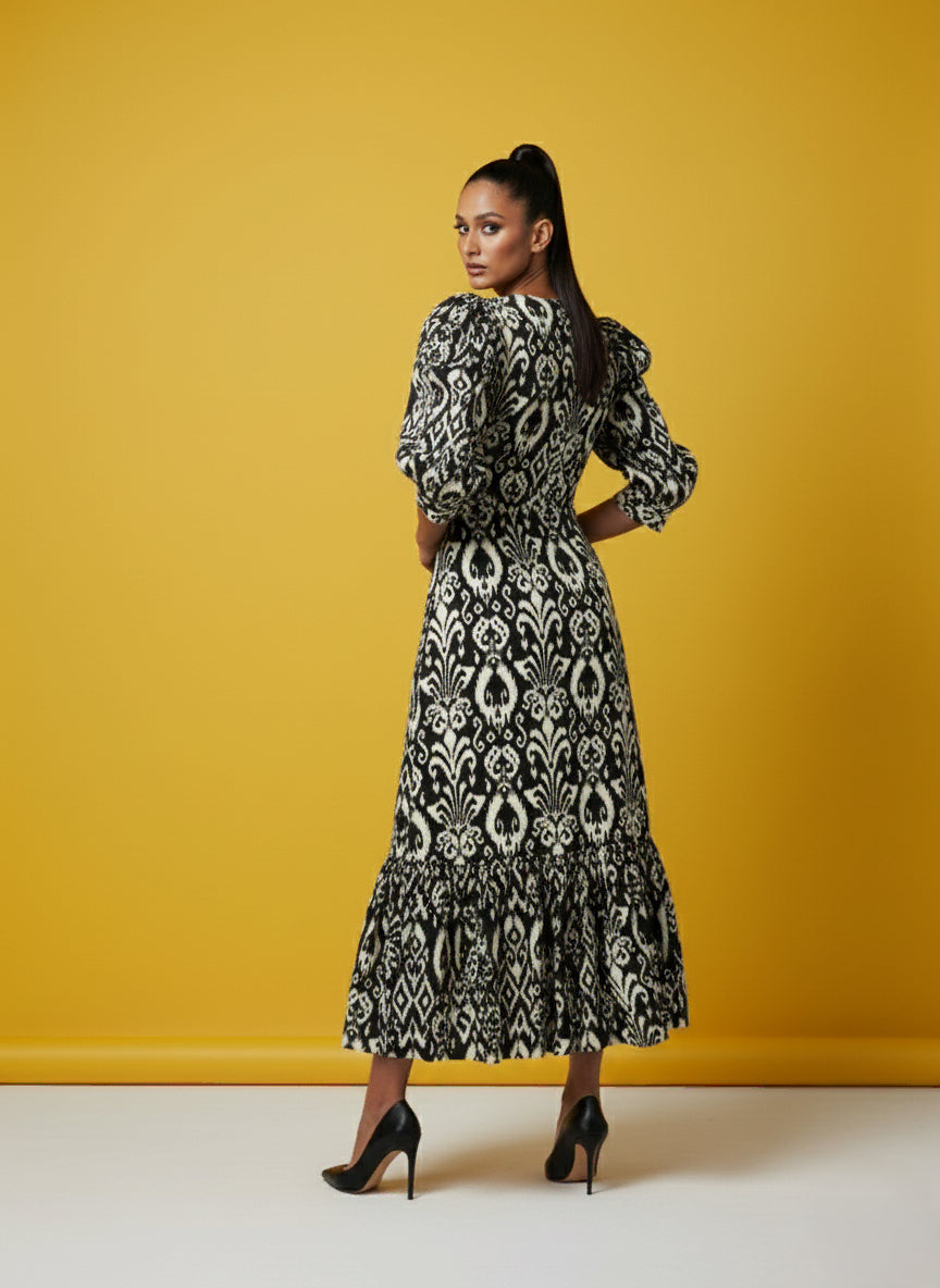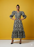 A chic black Cotton Blend printed one-piece with a bold geometric design, featuring a flattering V-neckline, ¾ sleeves, and a below-knee length for a classy finish. The soft cotton blend fabric ensures all-day comfort with easy gentle machine wash care. Designed for versatile styling, this dress transitions effortlessly from casual outings to special occasions. Pair it with heels for an elevated look or keep it simple with flats for everyday elegance.
