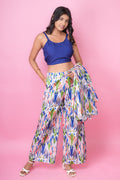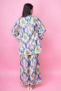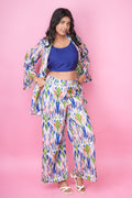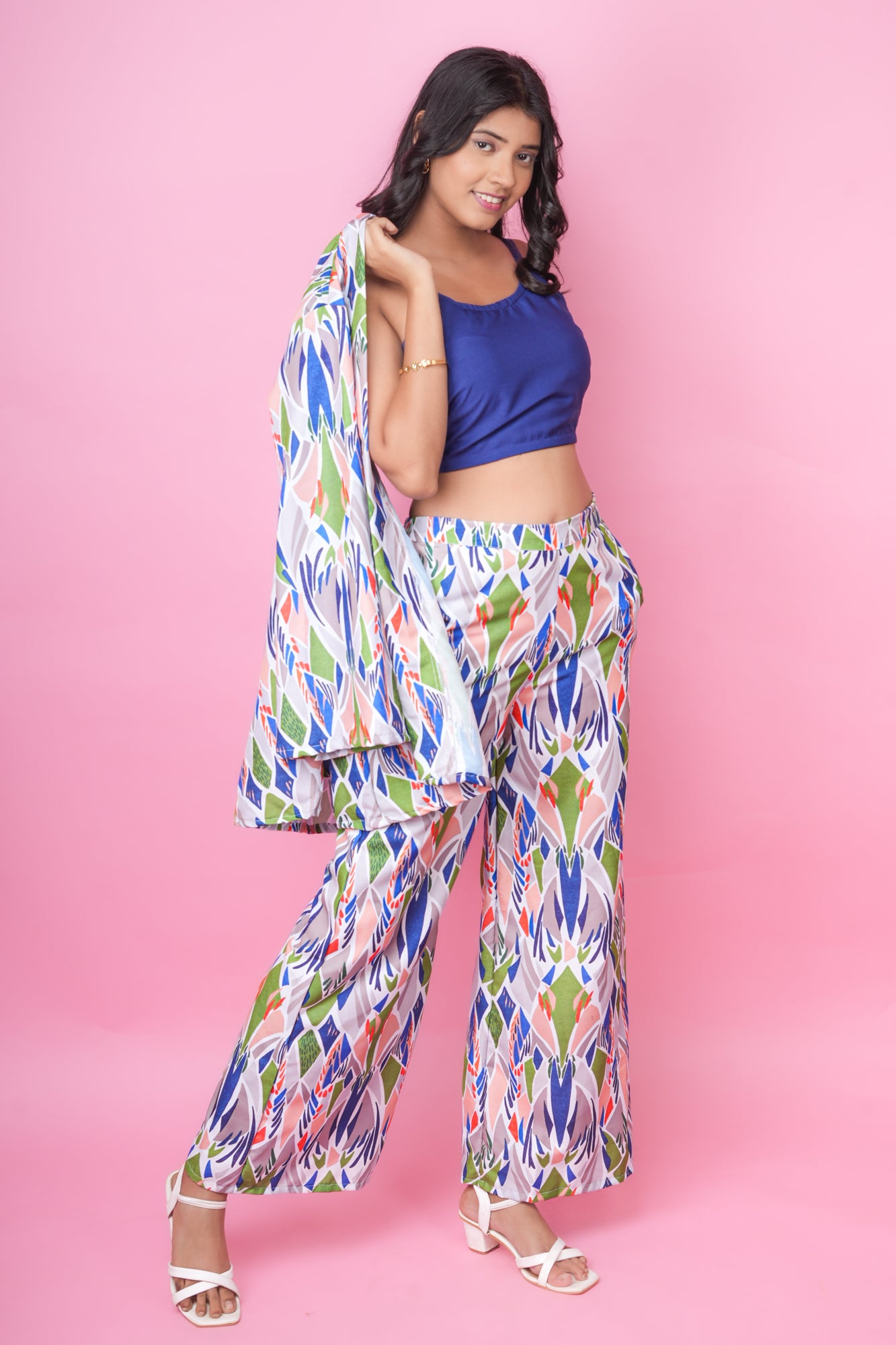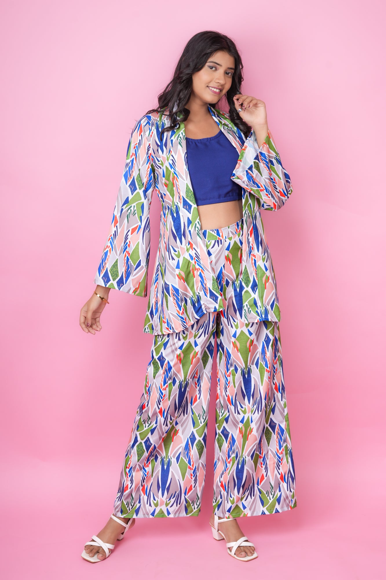 Elevate your style with this gray co-ord set, designed for both office and occasional wear. Featuring a thigh-length jacket with full bell sleeves and a vibrant multicolour geometric print, this set combines creativity with sophistication.