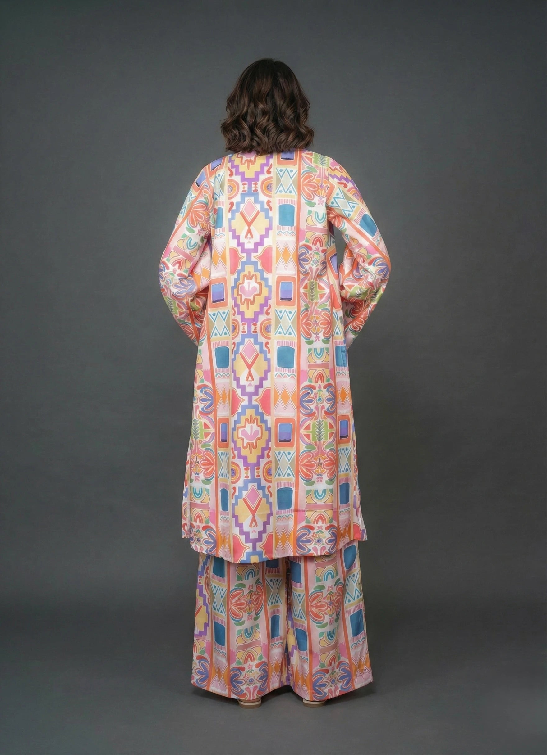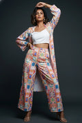 Paired with full-length palazzo pants in white, adorned with the same abstract print, the set is designed with a half-belt, half-elastic waistband, offering both comfort and a flattering fit. Crafted from cotton blend digital print, this set offers a chic, relaxed look for any occasion.