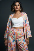 This elegant white co-ord set is perfect for both office and occasional wear, blending contemporary style with comfort. The below-knee jacket features full sleeves and a bold geometric print, while the square-neck inner with an abstract print adds a stylish layer to the ensemble.