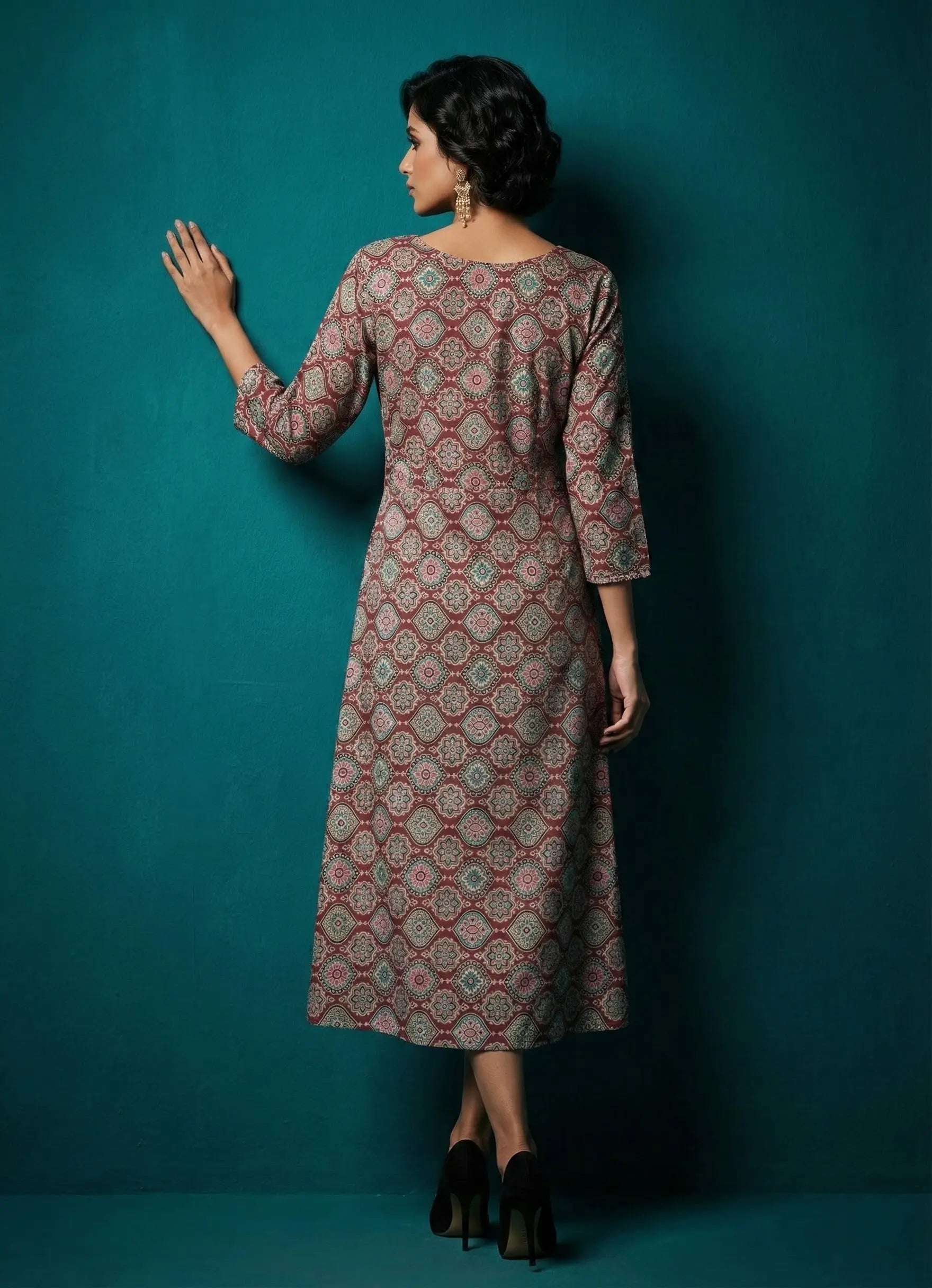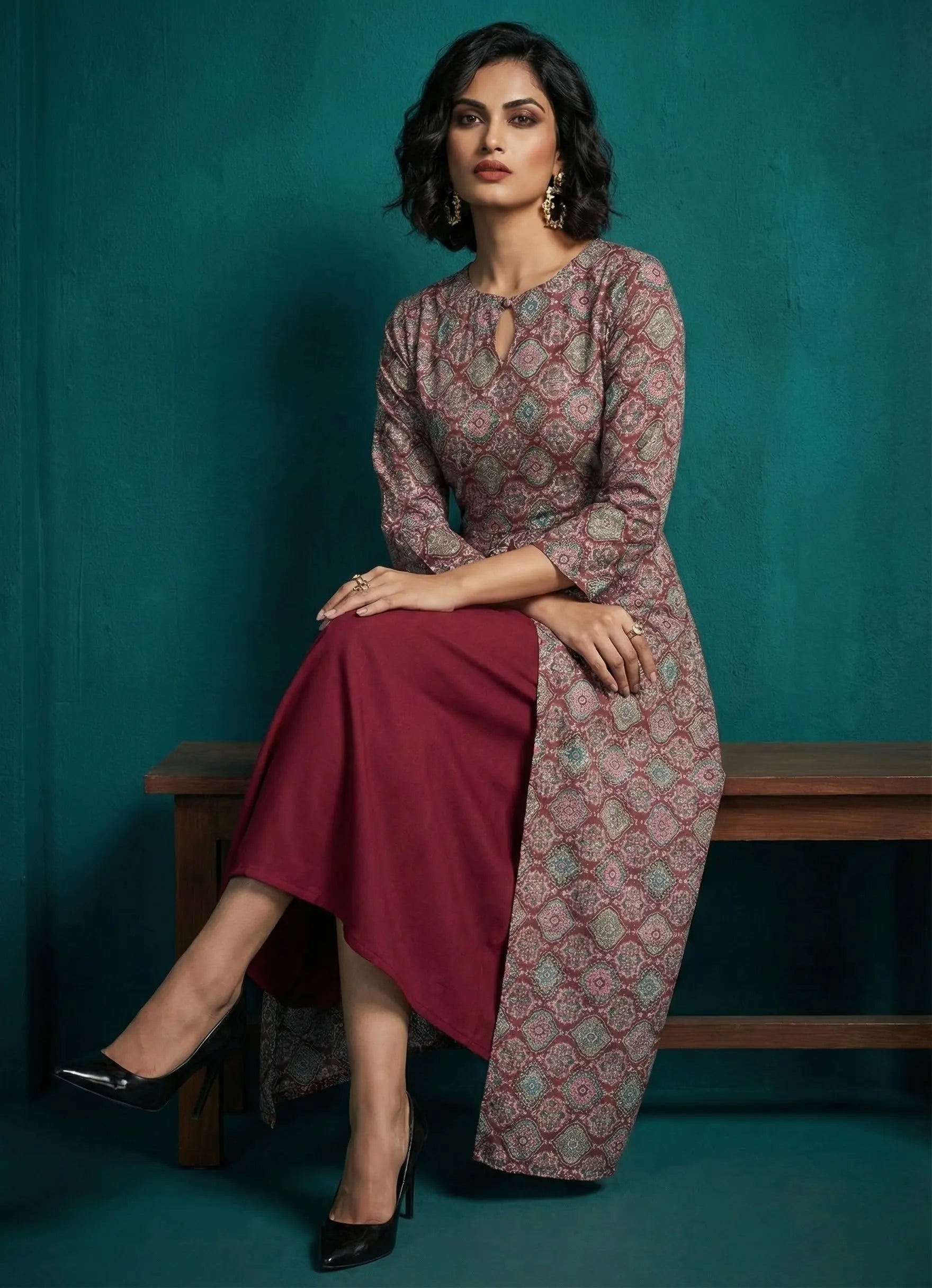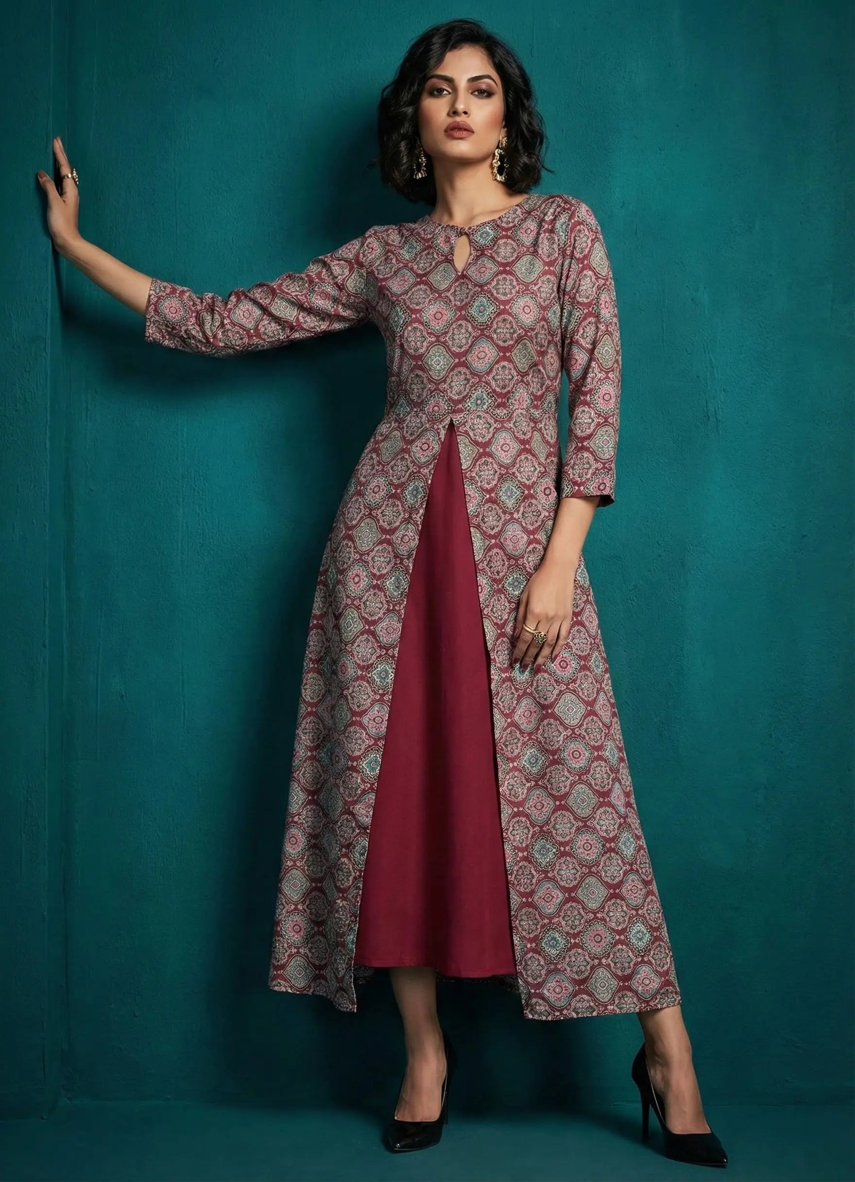 Introducing our Silhouette ensemble a stylish inner paired with a one-piece dress, perfect for casual occasions. Crafted from breathable Cotton Blend fabric in a rich maroon hue, the dress features 3/4th plain sleeves and a classic round neck, offering comfort and versatility. This ensemble combines elegance with ease for your casual outings.