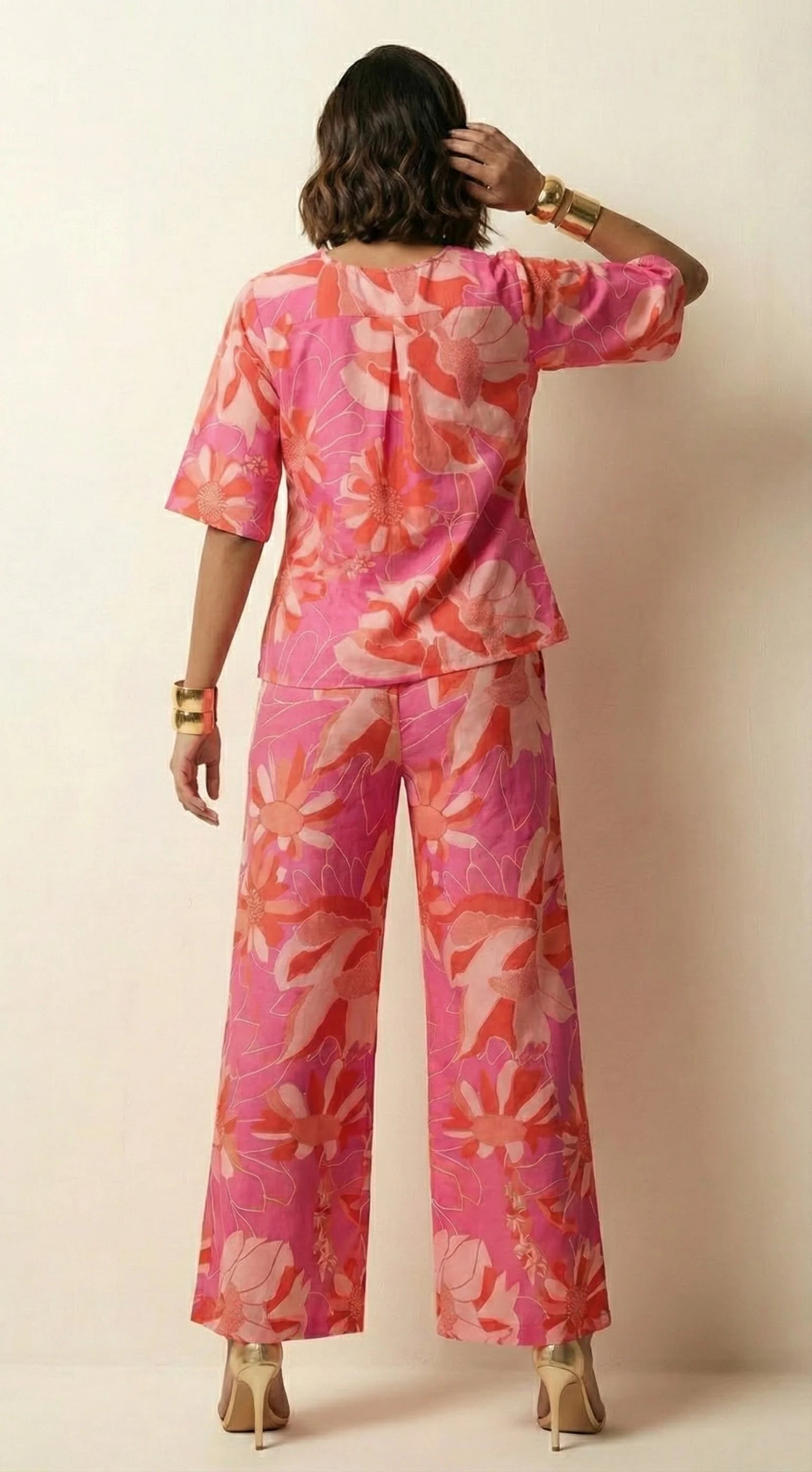 Brighten up your wardrobe with this Glam Yellow Co-Ord Set, featuring a waist-length top with elbow sleeves and a classic collar neck. Adorned with a beautifully spread floral print, the top pairs effortlessly with matching palazzo pants for a breezy, coordinated look. Made from soft cotton blend fabric with a gentle machine wash finish, this set is designed for comfort and elegance-perfect for both occasional and regular wear. The half belt, half elastic waistband ensures a secure and flattering fit.