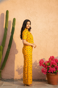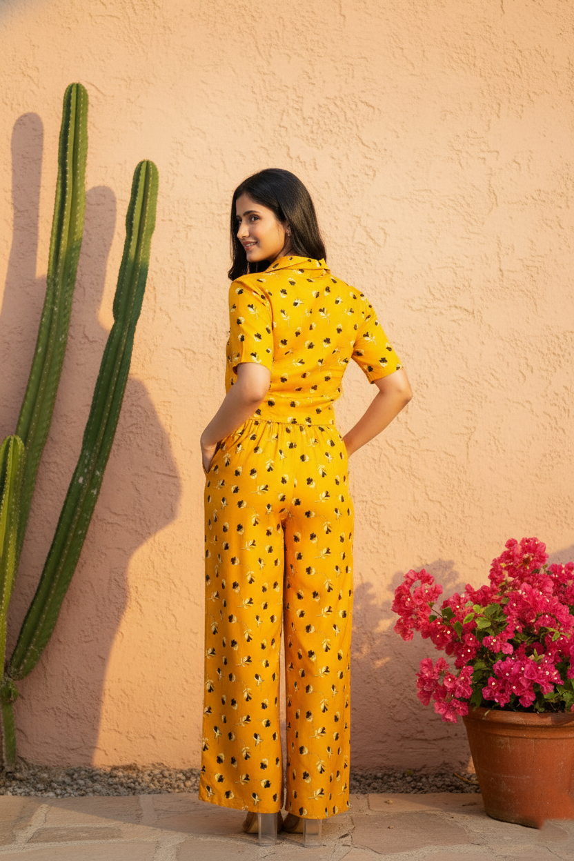 This vibrant glam yellow set features an elbow-sleeve, waist-length top with a classic collar neck, adorned with a scattered floral print. Made from comfortable Cotton blend fabric with gentle machine wash care, it offers both style and ease. The matching full-length palazzo pants share the same floral print and include a half belt and half elastic closure for a tailored fit. Perfect for occasional and regular wear.
