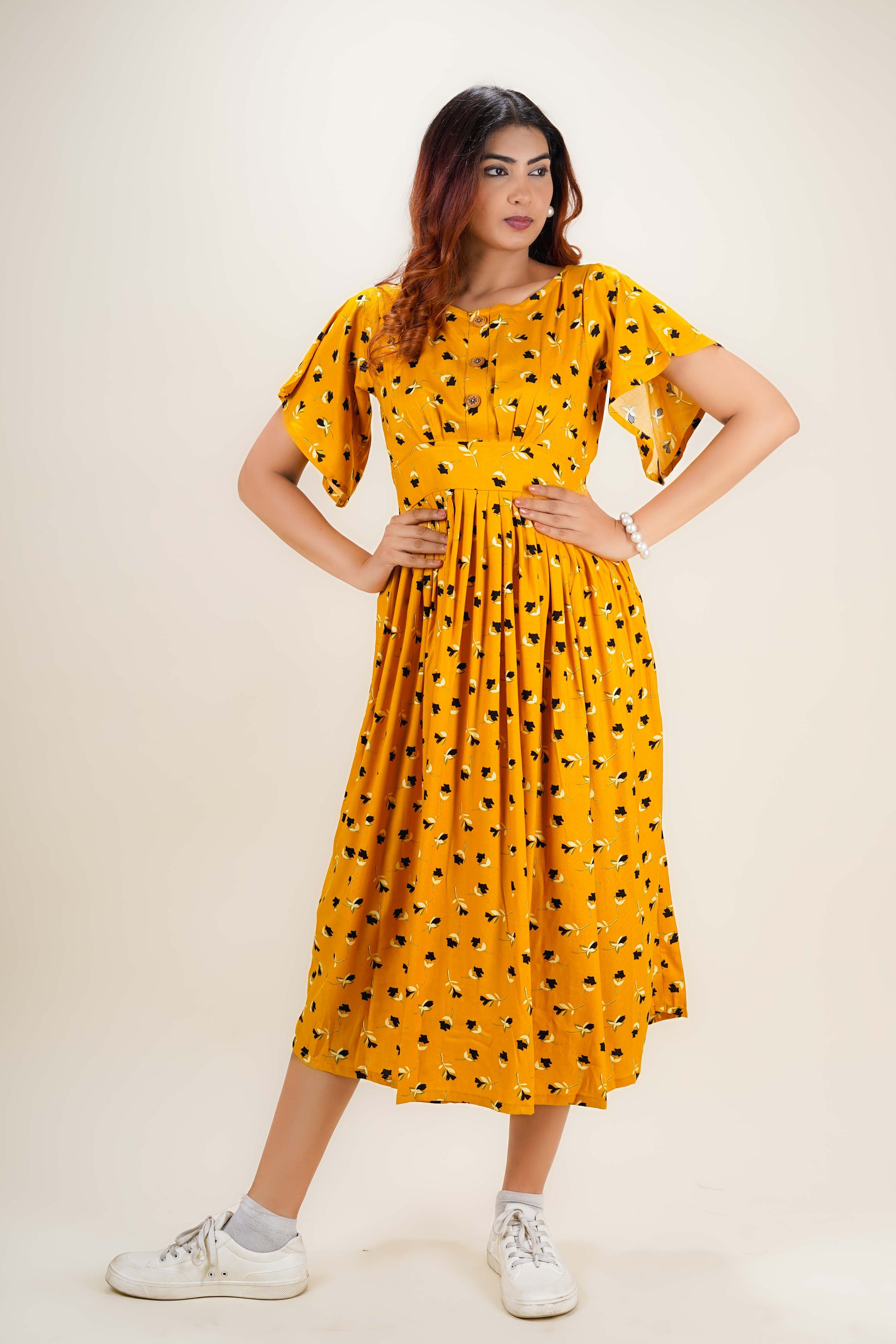Brighten your day with this chic Glam Yellow one-piece dress, adorned with a vibrant floral pattern print. Designed with elegant cap sleeves and a flattering boat neck, this below-knee length dress blends comfort with effortless style. Crafted from a breathable cotton blend with a gentle digital print, it’s perfect for both casual outings and occasional wear.