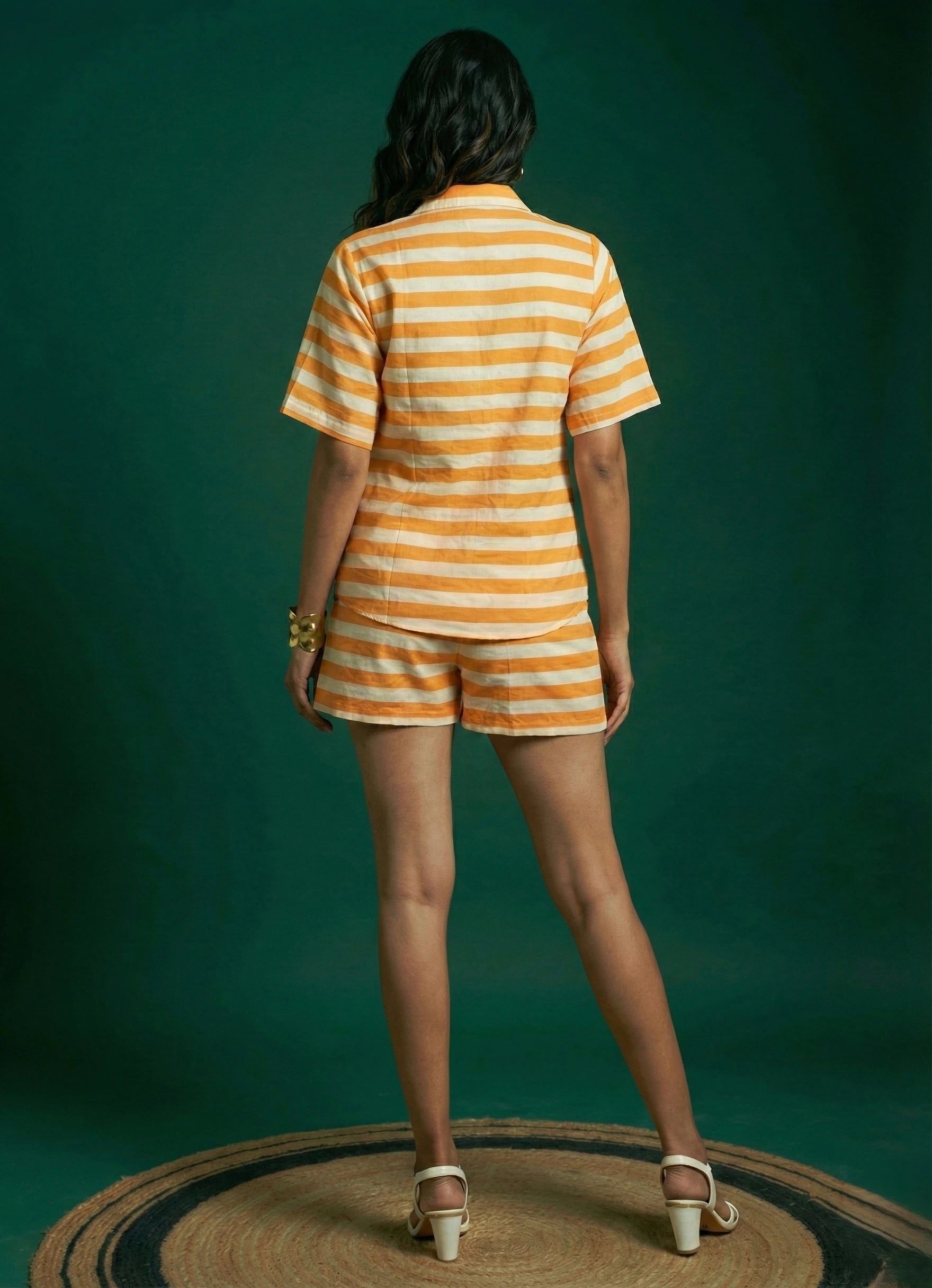 Brighten up your wardrobe with this yellow striped co-ord set, tailored for both office and occasional wear. Crafted in soft cotton blend digital print, the set features a hip-length top with elbow sleeves and a smart collar neck, offering a polished yet relaxed look.