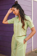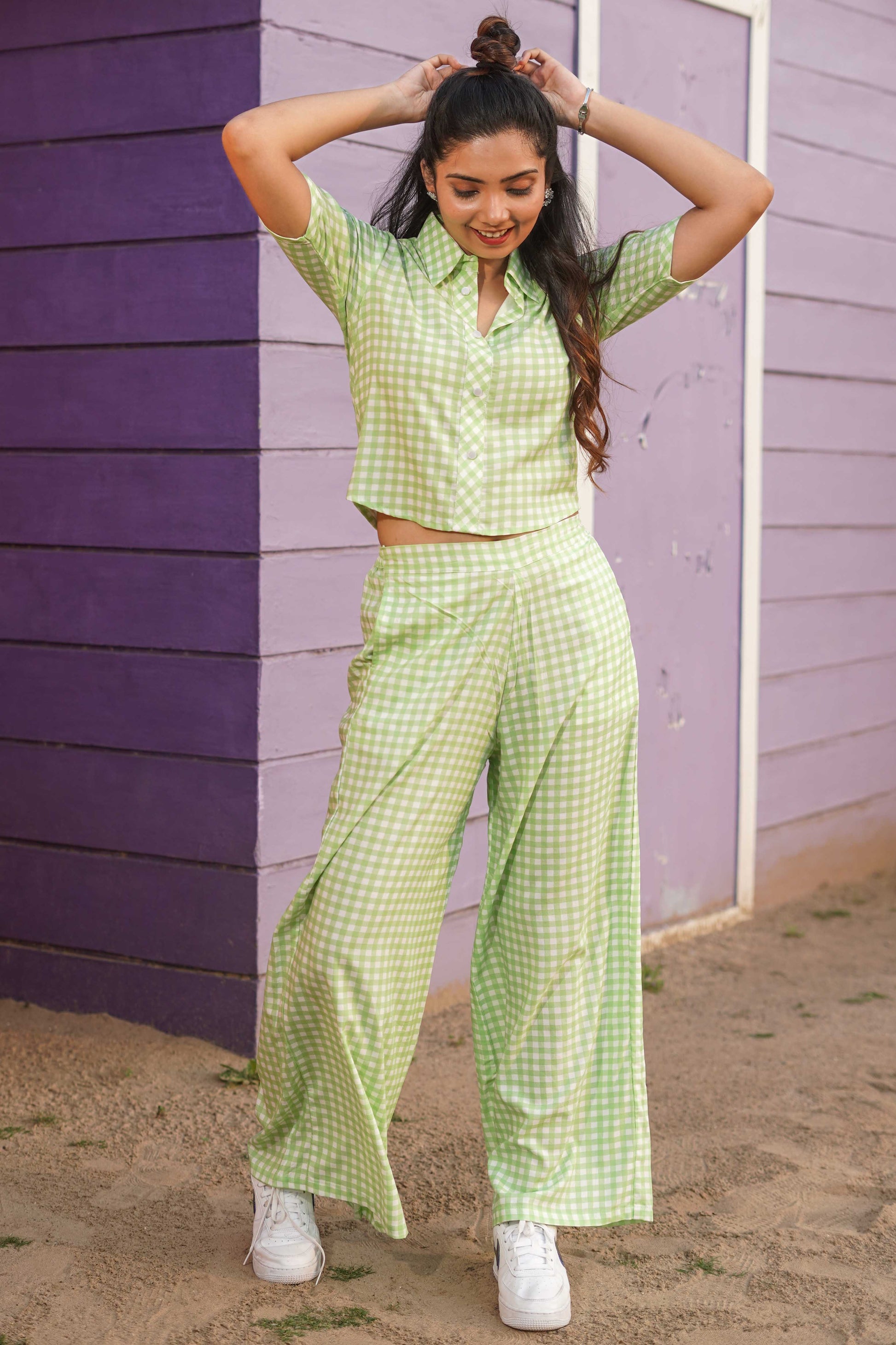 Add a classic charm outfit to your wardrobe. This grass green co-ord set crafted out of checks printed Cotton Blend fabric. Giving out a trendy and playful vibe this co-ord set consists of a top in crop shirt pattern with collar, half sleeves and white buttons on front placket . this shirt is paired up with similar fabric pant consisting of two pocket.