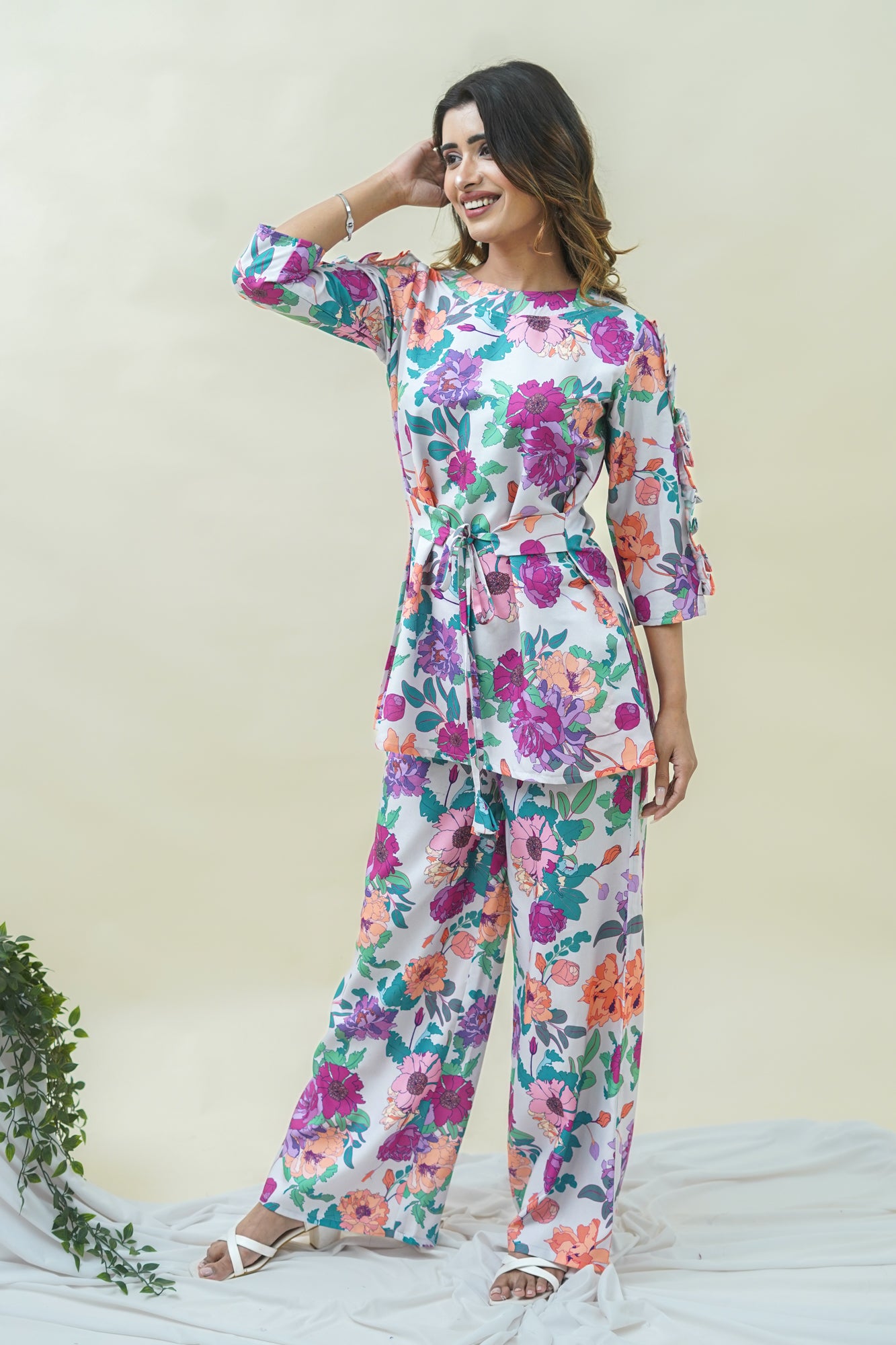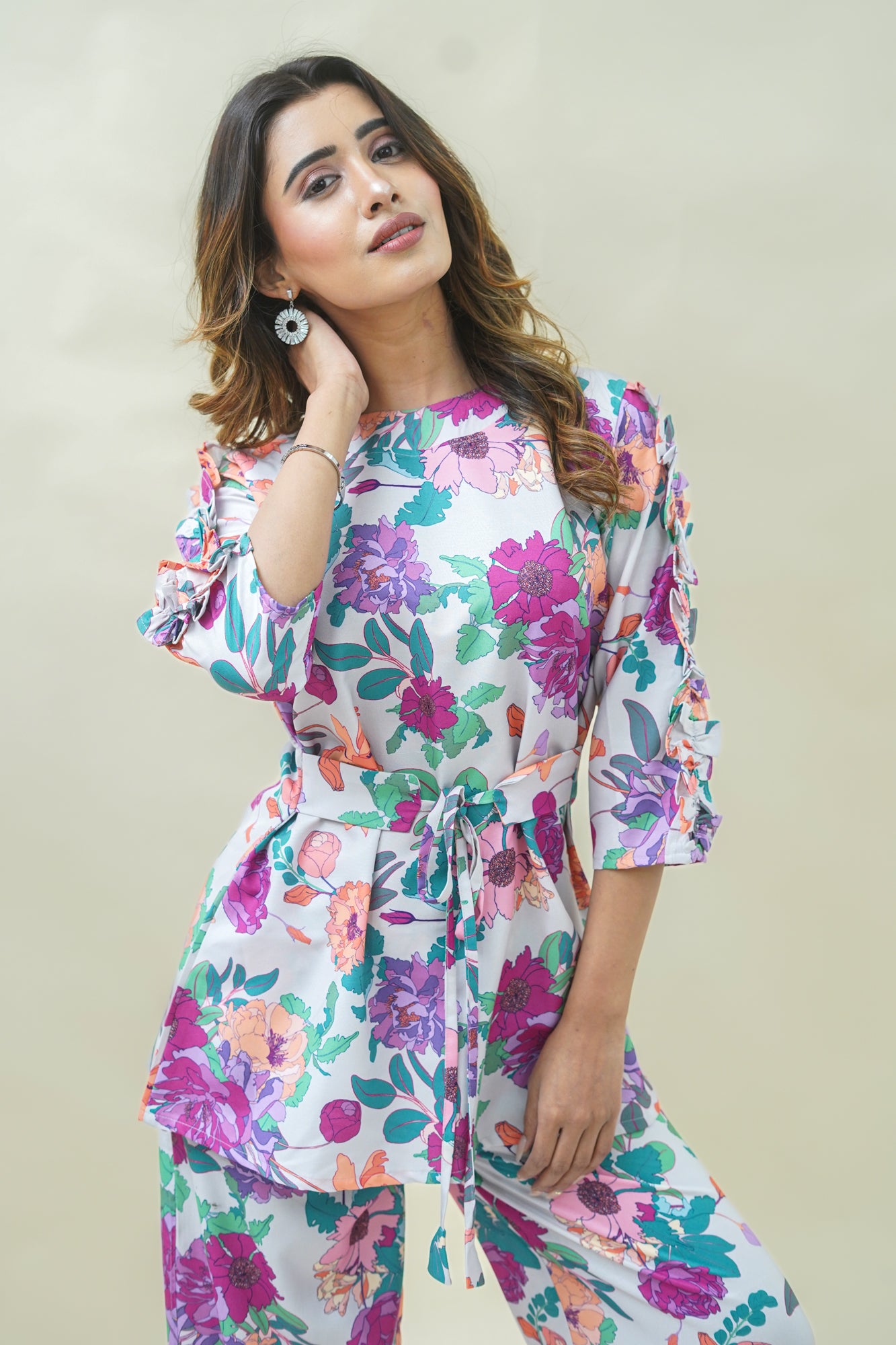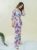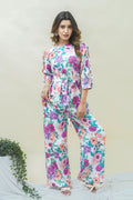Add a touch of charm to your wardrobe with this lovely grey top and pant set! The ¾ sleeved top features a classic round neck, delicate ruffle strip sleeves, and a beautiful floral print that adds a whimsical touch. The matching pant has a comfortable full-length design with a half belt and half elastic closure, providing a flattering fit.