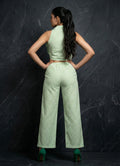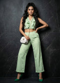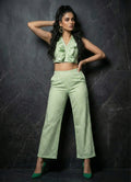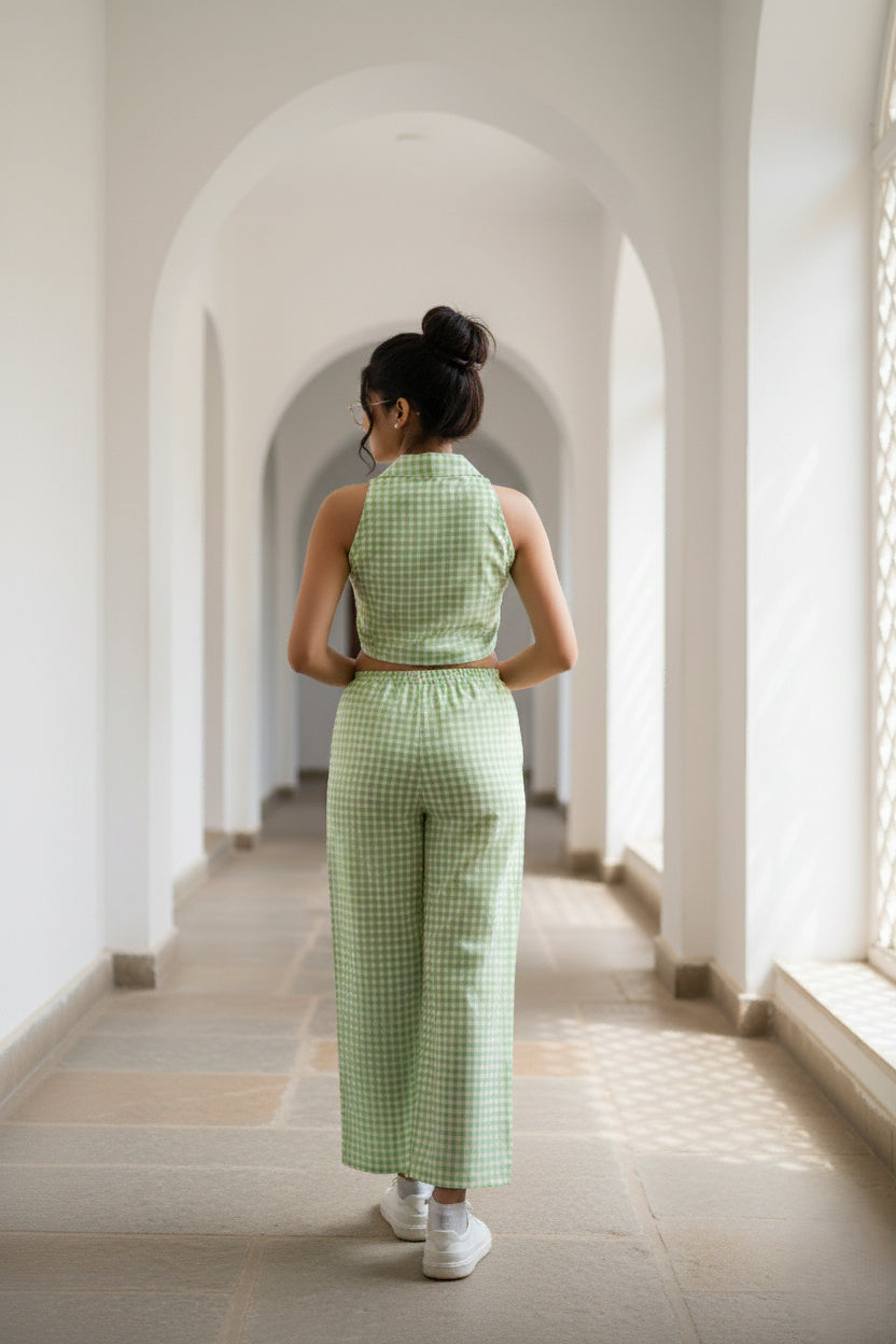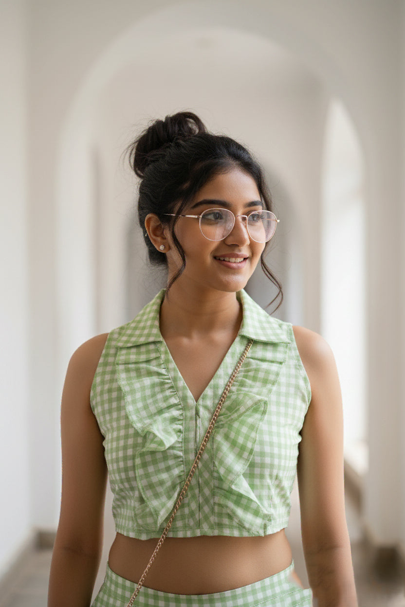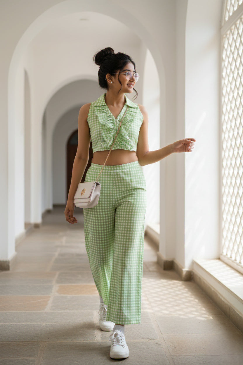 This stylish green co-ord set features a sleeveless crop top with ruffle patch detailing, a flattering V-neck, and a playful cheque print. Paired with matching palazzo pants and a comfortable half-belt, half-elastic waistband, it’s perfect for both casual and occasional wear.