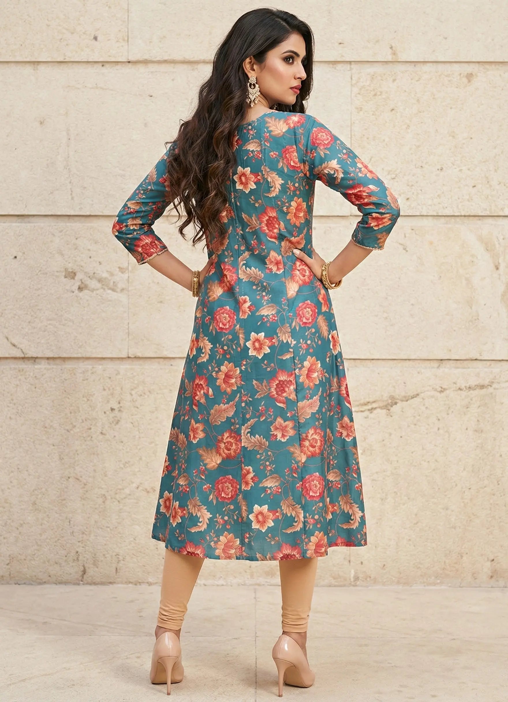 A green outfit is must in your festive collection. Designed out from red yellow floral printed Cotton Blend fabric is a kali overlapped patterned A-line kurta with regular three-fourth sleeves and embellishment of golden lace on front yoke and drawstrings attached on side.