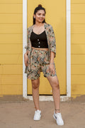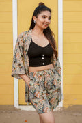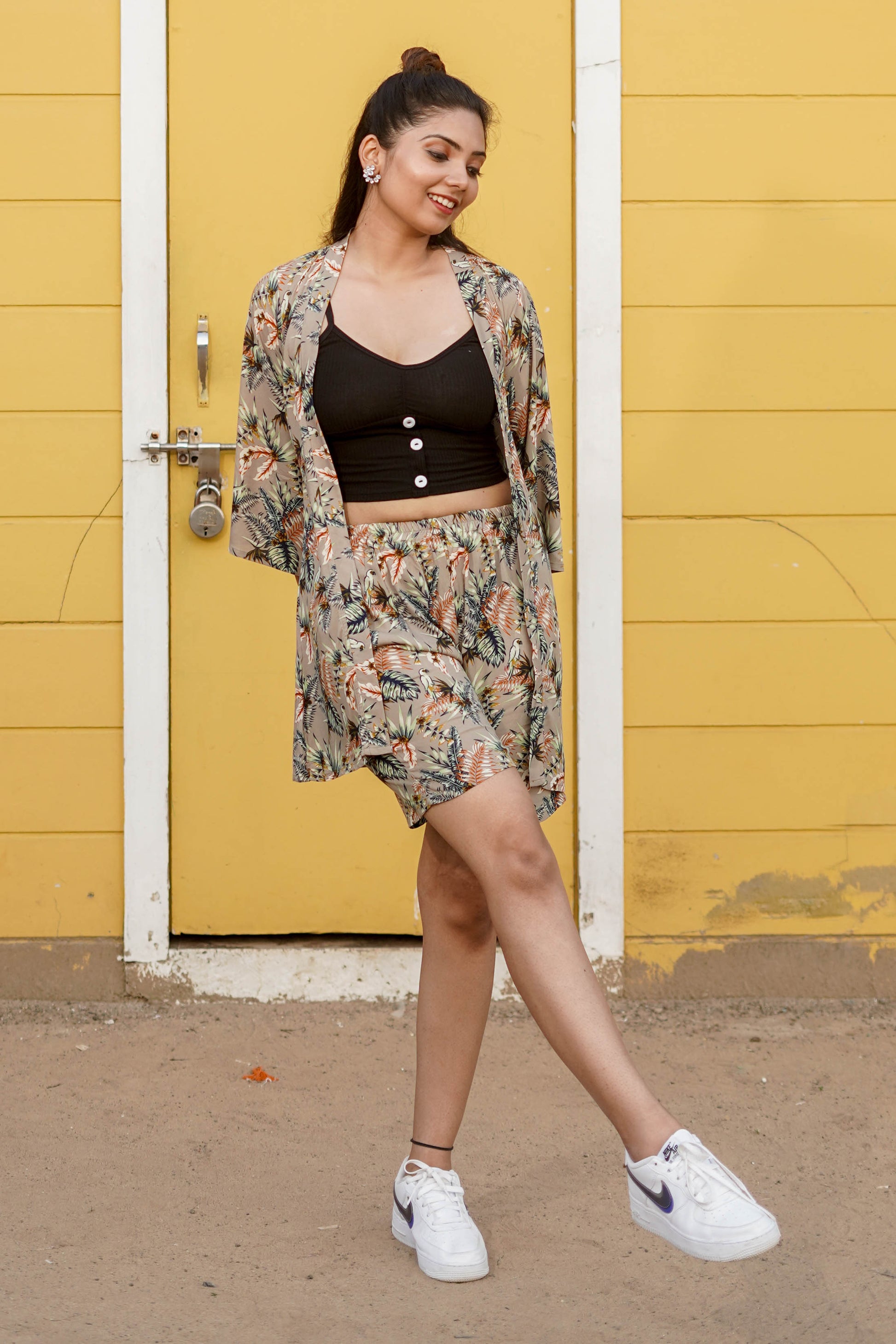 Looking for a comfortable outfit for a chill weekend. We bring you this tropical printed co-ord set crafted on cotton fabric. It has a pattern of kimono style with a modern touch above knee length jacket having three-forth flared sleeves paired with shorts having elastic belt for proper fit and pockets.