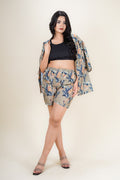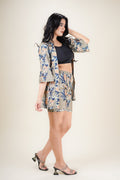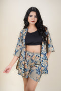 Looking for a comfortable outfit for a chill weekend. We bring you this tropical printed co-ord set crafted on cotton fabric. It has a pattern of kimono style with a modern touch above knee length jacket having three-forth flared sleeves paired with shorts having elastic belt for proper fit and pockets.