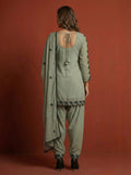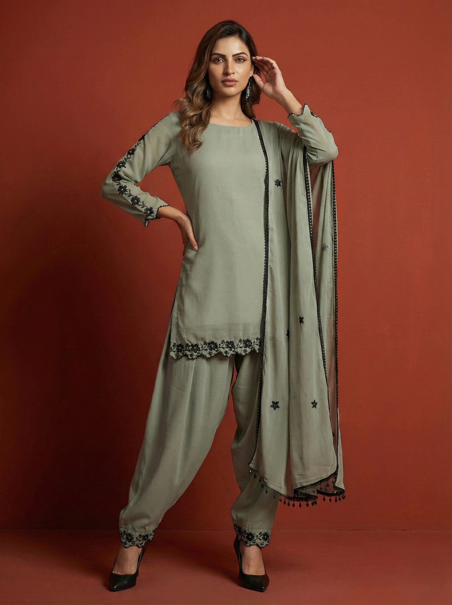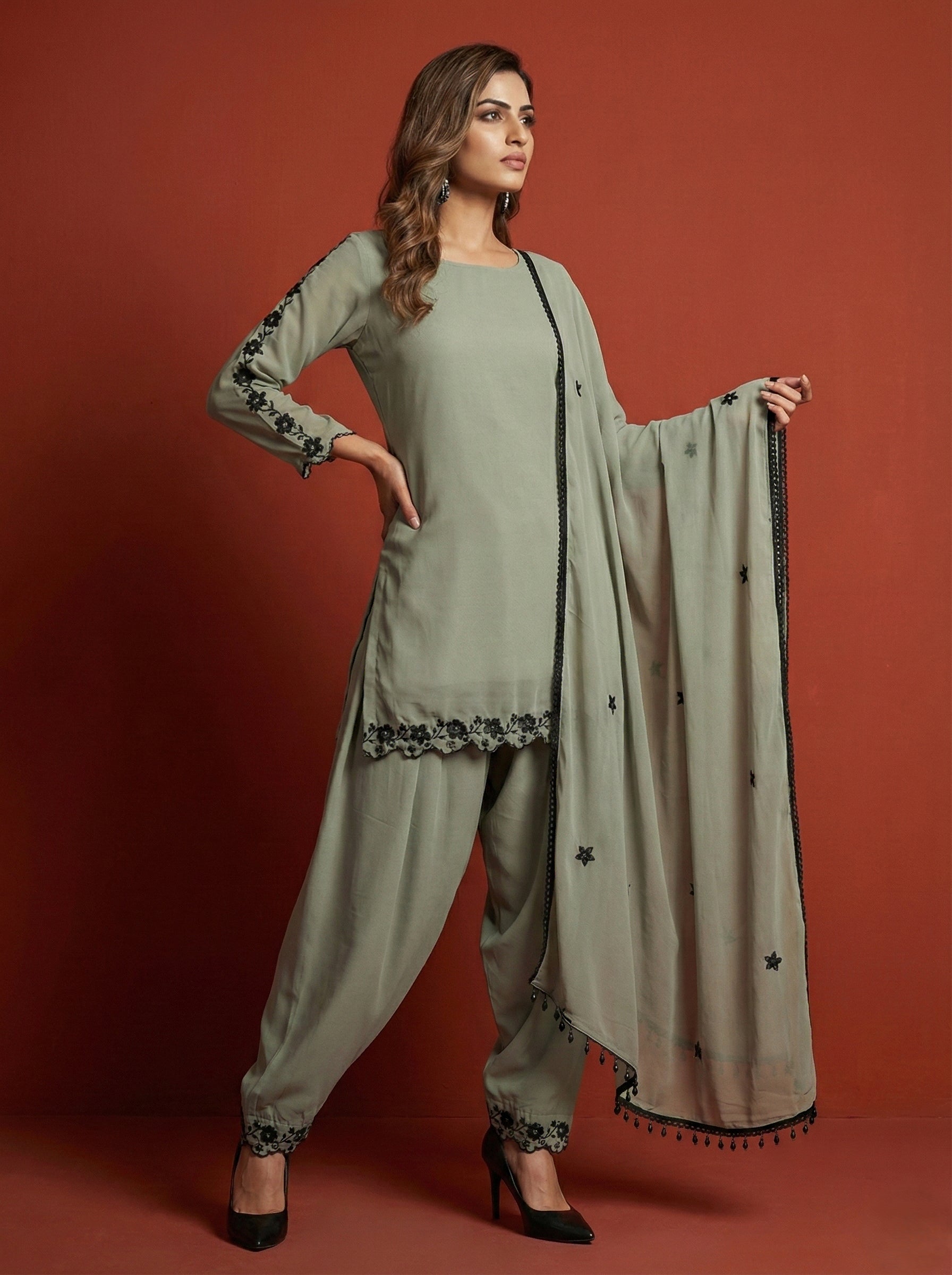 Turn heads and steal the spotlight in our Grey Embroidered Faux Georgette Farshi Palazzo Set- where ethnic elegance meets modern glam!