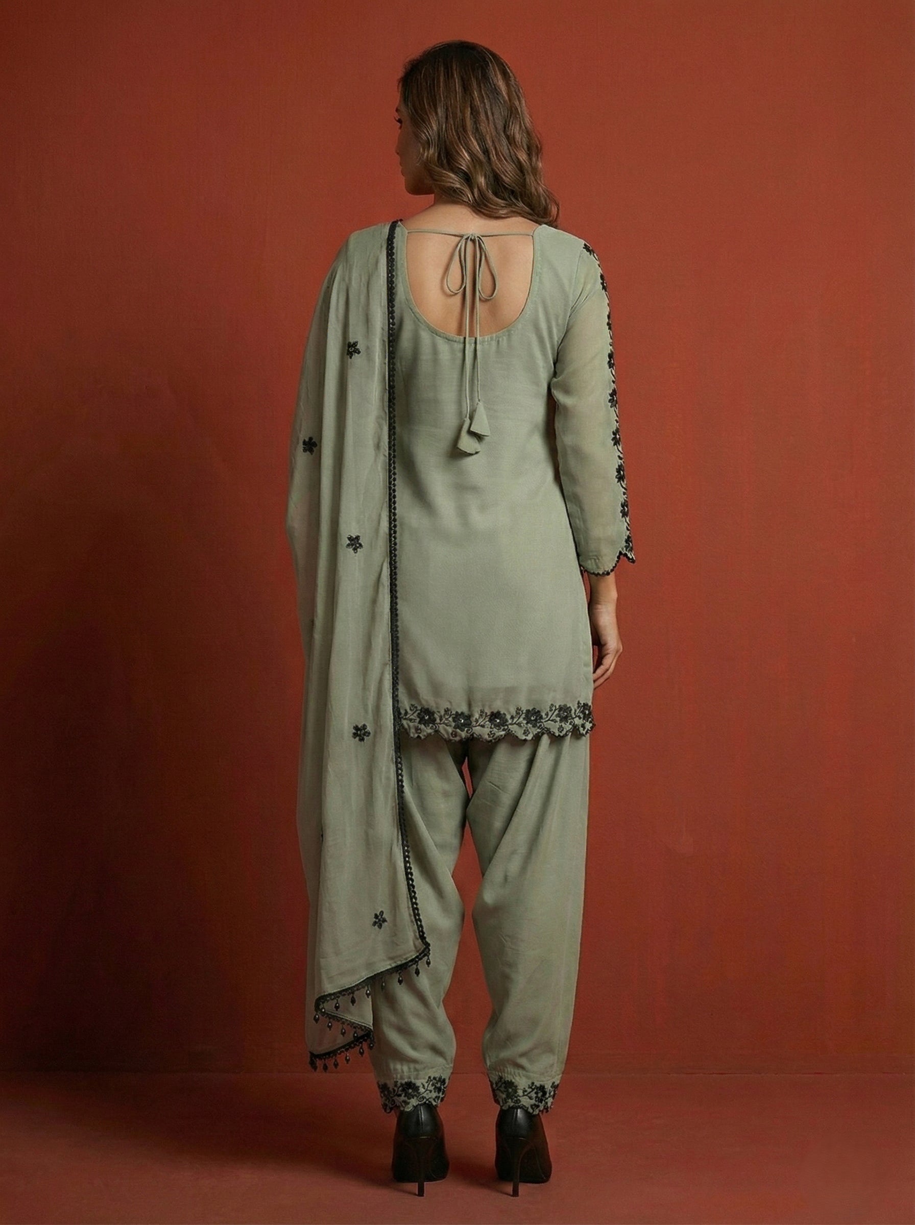 This stunner is crafted in luxe faux georgette, dripping with intricate embroidery and sparkling mirror work that glistens with every move. The flowy Farshi palazzo adds drama and comfort, while the breezy dupatta ties the look together for pure festive perfection.
