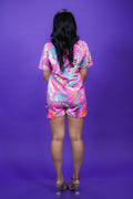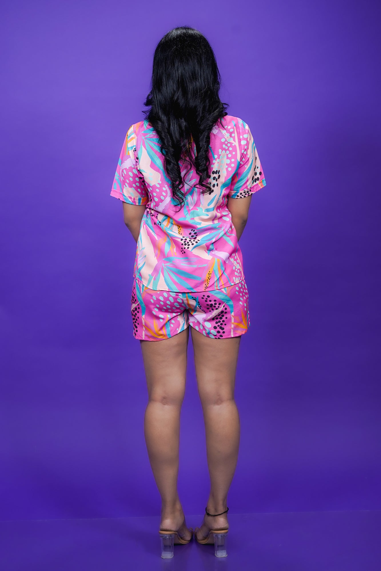This vibrant set features a striking hot pink top with elbow-length, plain folded sleeves and a classic collar neck, adorned with an abstract jungle print. The waist-length Cotton blend top offers comfort and style, perfect for gentle machine wash care. Complementing the top, the white shorts pant showcases the same abstract jungle print, sitting above the knee with a convenient half belt half elastic closure. Ideal for occasional and regular wear, this ensemble blends bold colors and prints for a fresh, stylish look.
