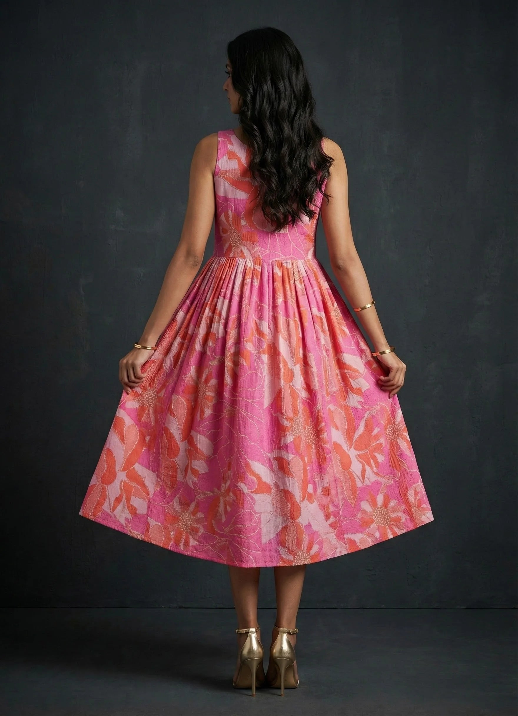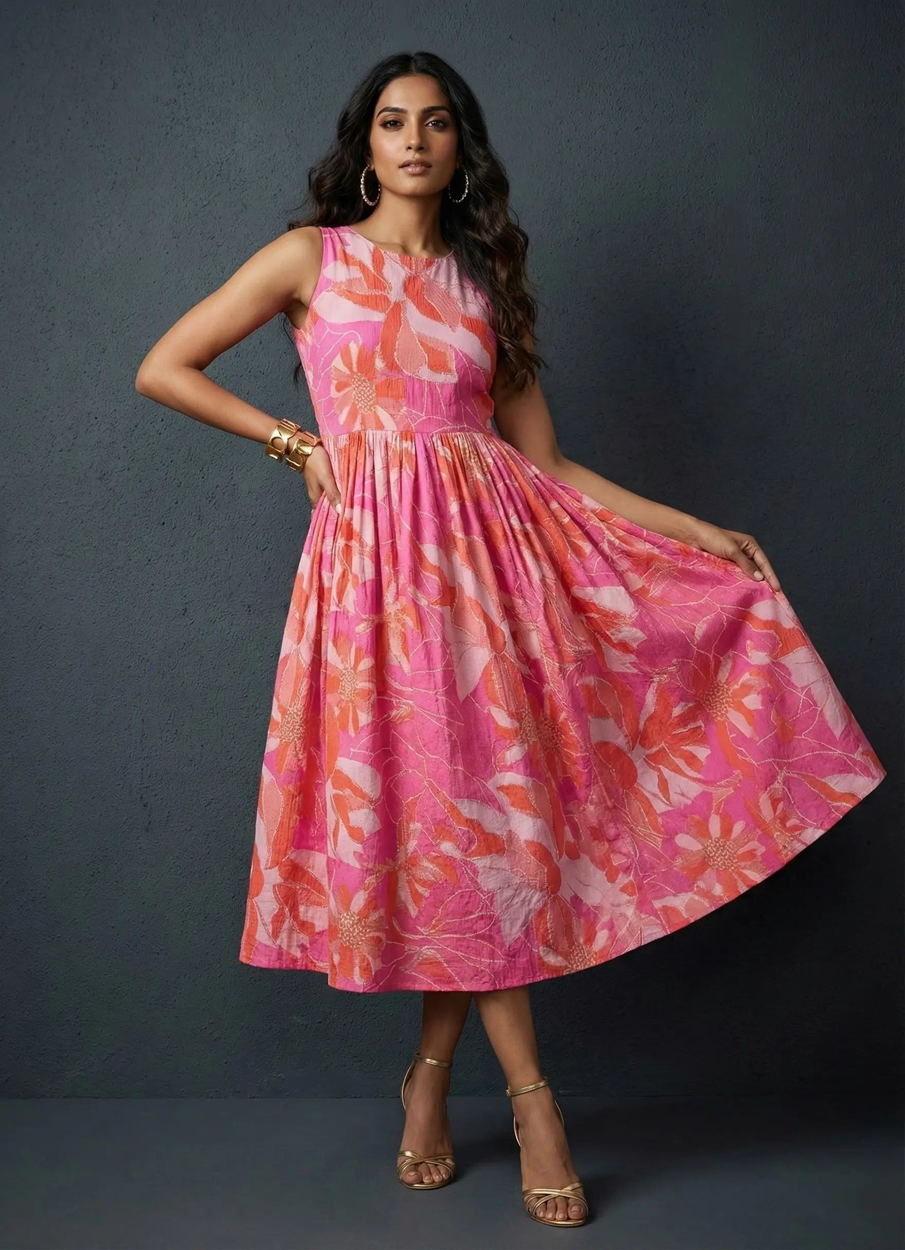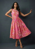 Step out in vibrant charm with this hot pink one-piece dress, featuring a classic boat neck and sleeveless design. Adorned with an elegant floral print and crafted from a soft cotton blend, the below-knee length silhouette includes practical side pockets—perfect for both everyday wear and special occasions.