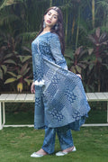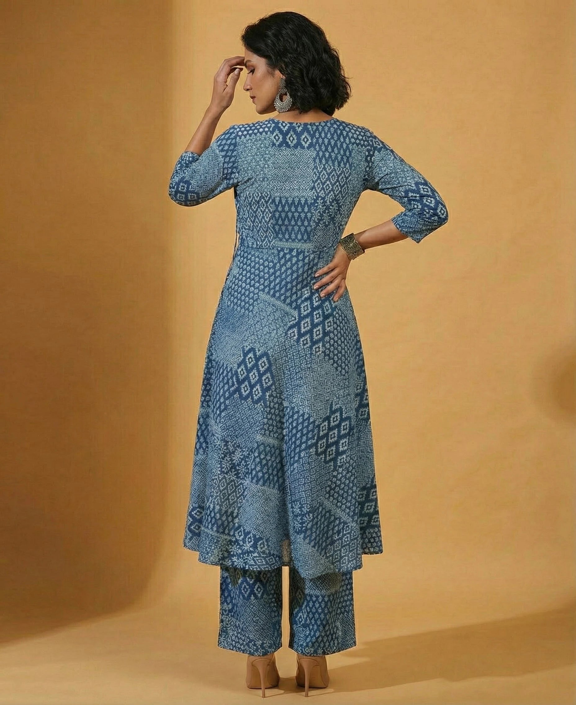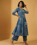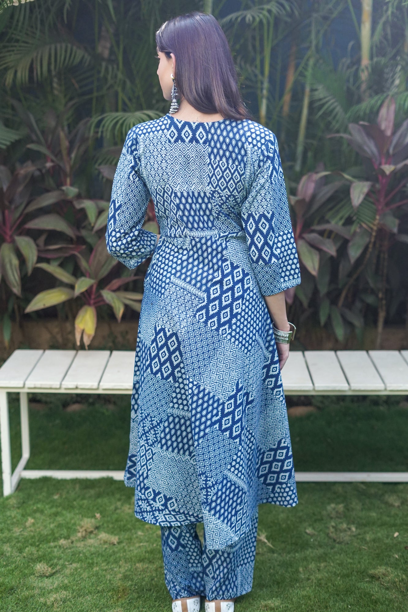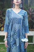 Introducing our exquisite Indigo Angrakha Cut Anarkali, perfect for festive occasions. Crafted from hand-painted Cotton Blend fabric, this Anarkali features a round V-neck and 3/4th sleeves with a plain style. The standout feature is the delicate white lace detailing, adding a touch of sophistication to the ensemble. Whether you're celebrating Diwali or attending a special event, this Indigo Angrakha Cut Anarkali is sure to make you stand out.
