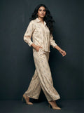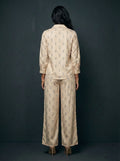 The coordinating ivory bottoms with a narrow bottom fit are also decorated with the same block print and designed with a half-belt, half-elastic waistband for a comfortable, flattering fit. Crafted from cotton blend digital print, this set offers a stylish and versatile option for various occasions.