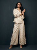 This elegant ivory co-ord set is perfect for both office and occasional wear. The hip-length top features full cuffed sleeves, a classic collar neck, and is adorned with a timeless block print, adding a touch of sophistication.