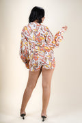 A charming co-ord set in elegant ivory, featuring a floral printed shirt with full puff sleeves and a smart collar neck. Crafted in soft Cotton blend digital print, the shirt falls at the waist for a tailored yet relaxed look. Paired with matching floral short pants featuring a half belt and half elasticated waistband for added comfort. Ideal for both casual and occasional wear, this outfit blends modern flair with timeless femininity. Gentle machine wash.