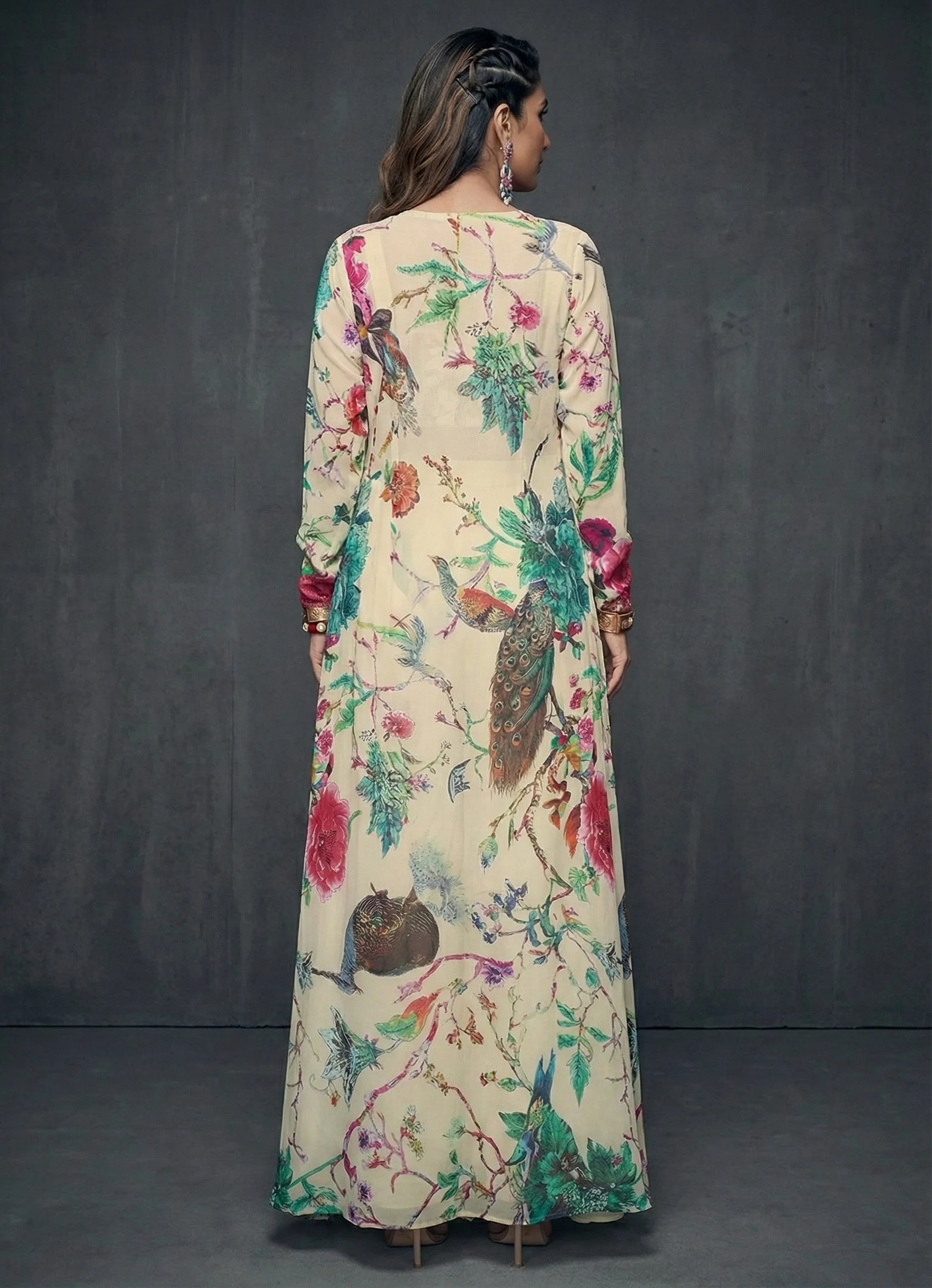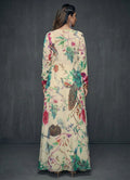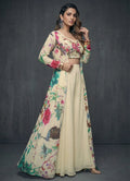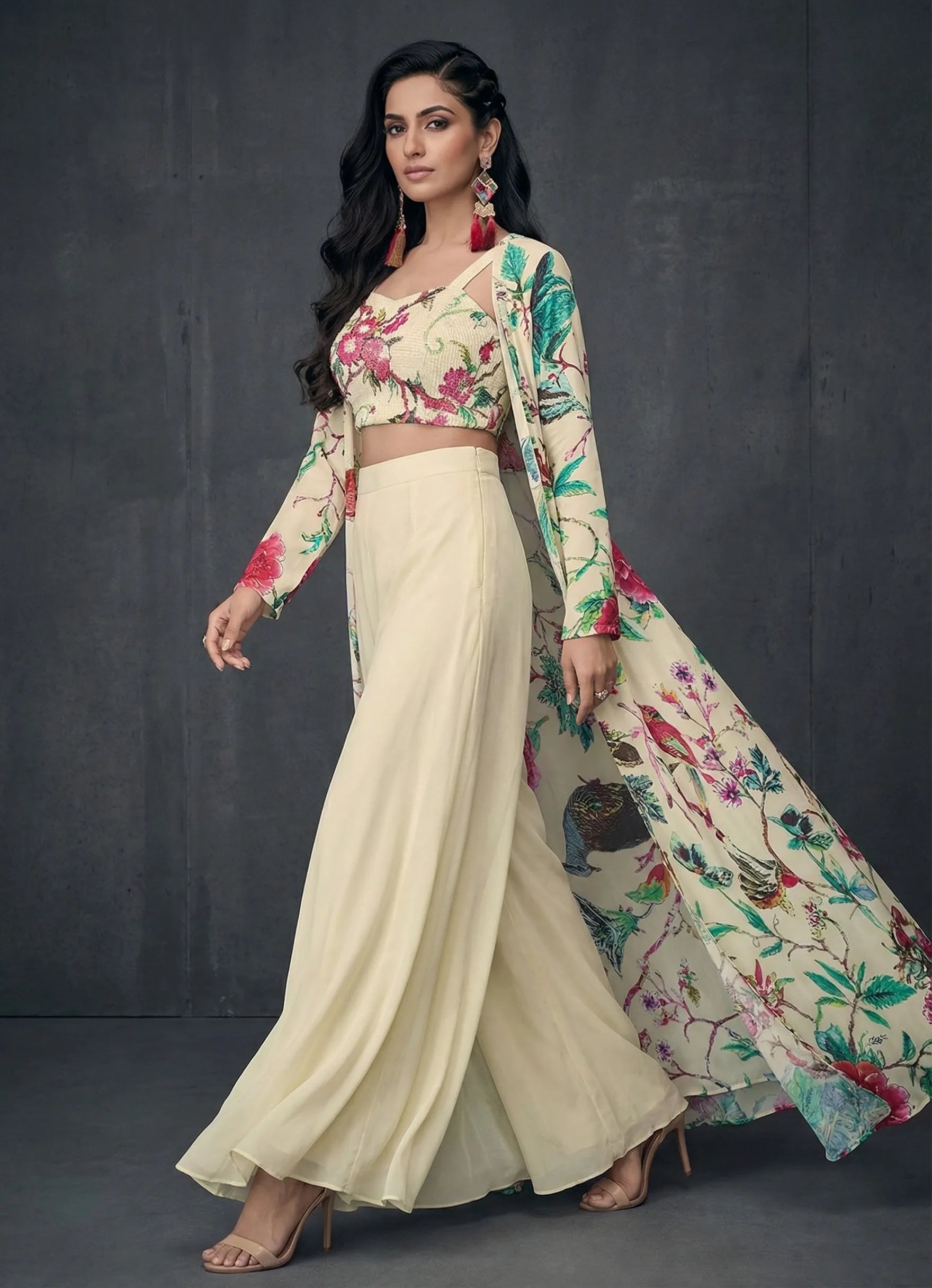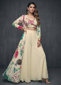 A floor-length floral abstract flare jacket paired with sweetheart square-neck floral inner, ivory palazzo pants, and top, perfect for festive and occasional wear. The elegant full-sleeve jacket adds flowy charm, while the soft digital print enhances its rich appeal. Comfortable half-belt half-elastic palazzos complete the look with a blend of grace and ease.