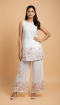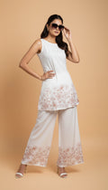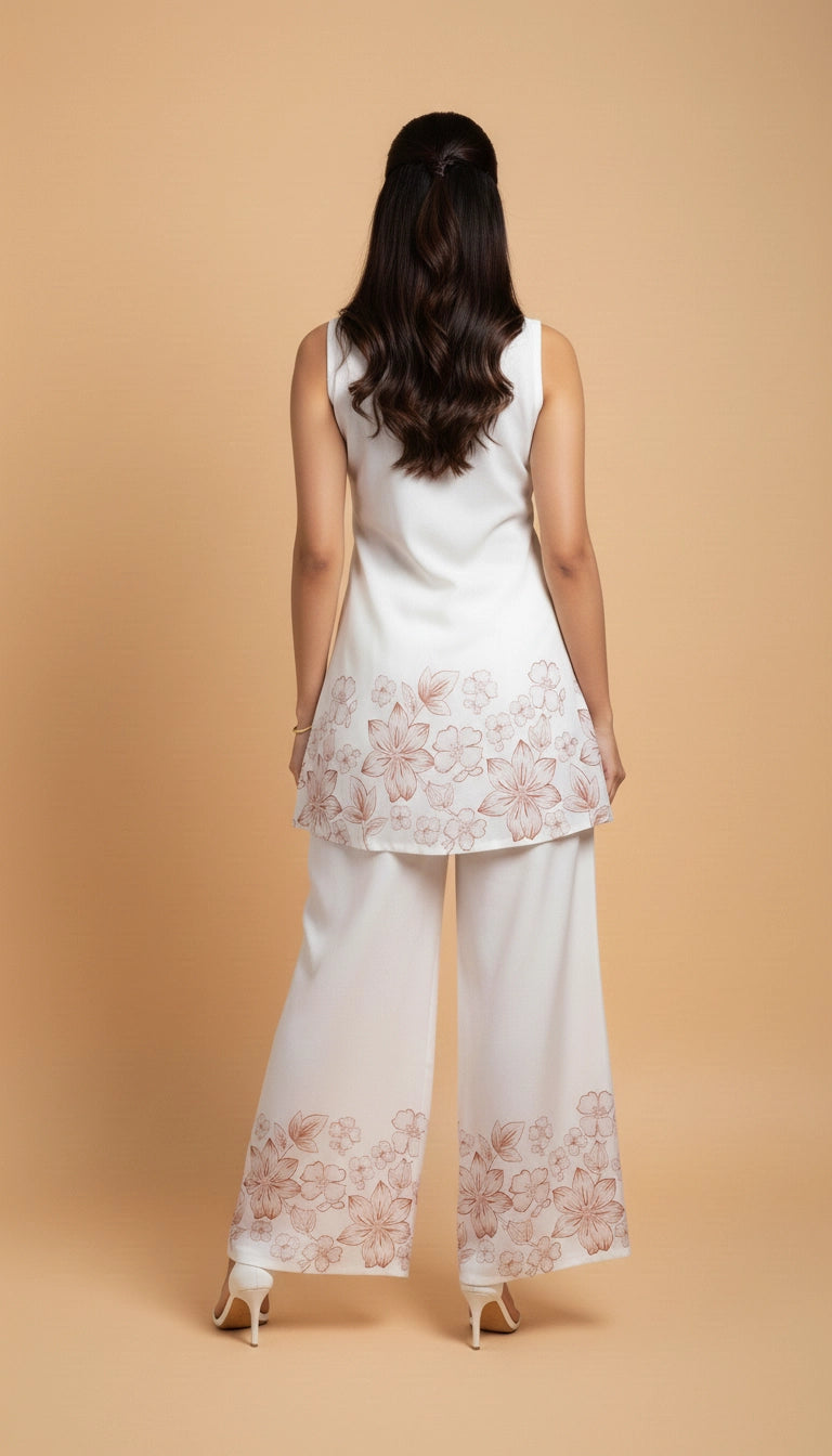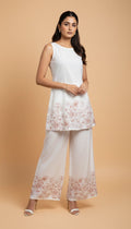 A soft ivory co-ord set crafted for effortless elegance. The sleeveless straight-fit top features delicate floral placement print along the hem, paired with flowy wide-leg palazzos detailed with matching floral accents.