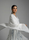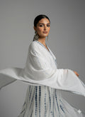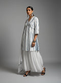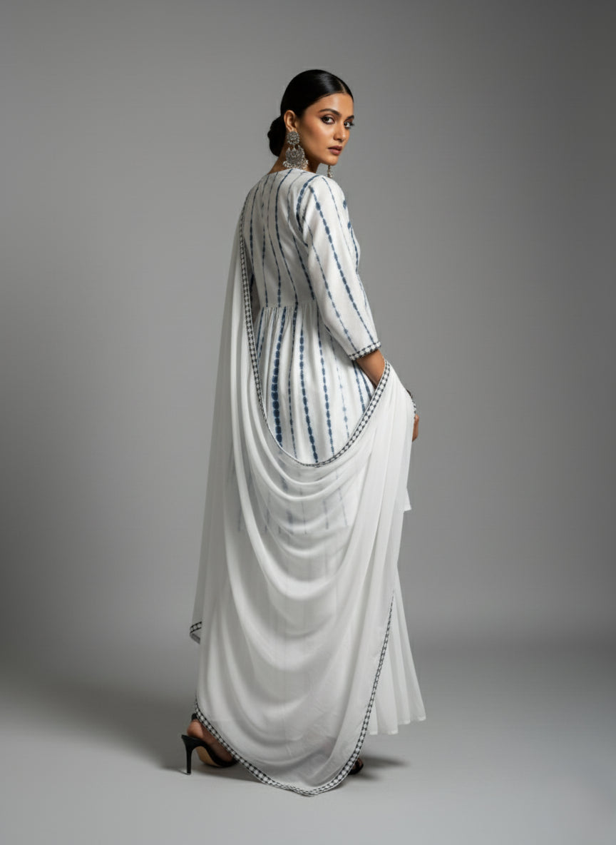 A white cotton blend kurti with ¾ sleeves and V-neck featuring a subtle tie & dye print, paired with full-length georgette gharara pants and a matching georgette dupatta, perfect for casual and occasional wear.