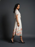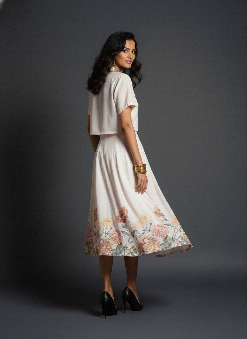 A chic cotton blend crop top with elbow sleeves, V-collar neck, and position print paired with a matching ivory A-line inner dress in below-knee length, perfect for both occasional and regular wear. The crop top adds a trendy edge while the flowing A-line inner ensures comfort and grace. This versatile set can be styled for festive gatherings, casual outings, or semi-formal occasions with the right accessories.