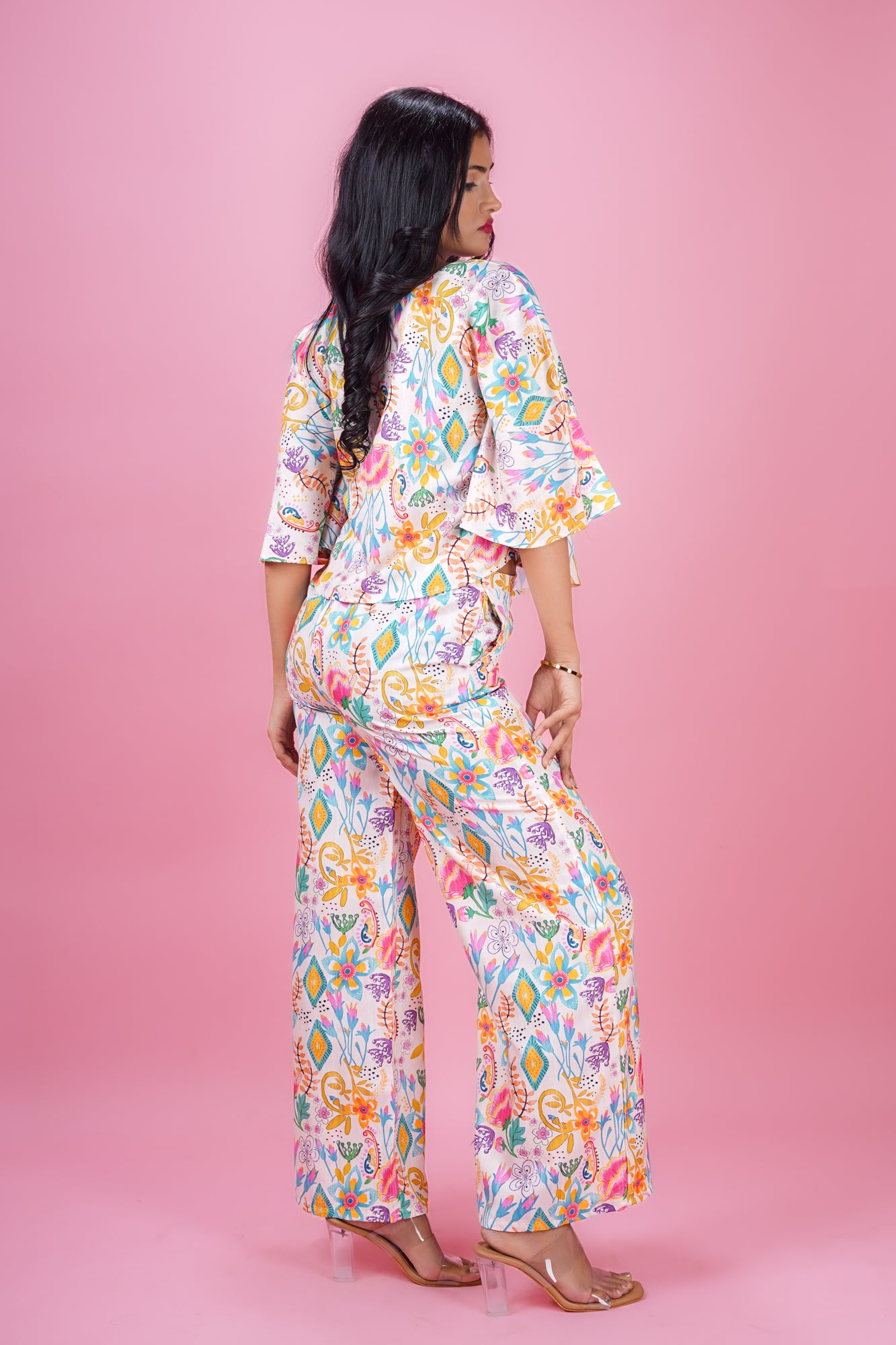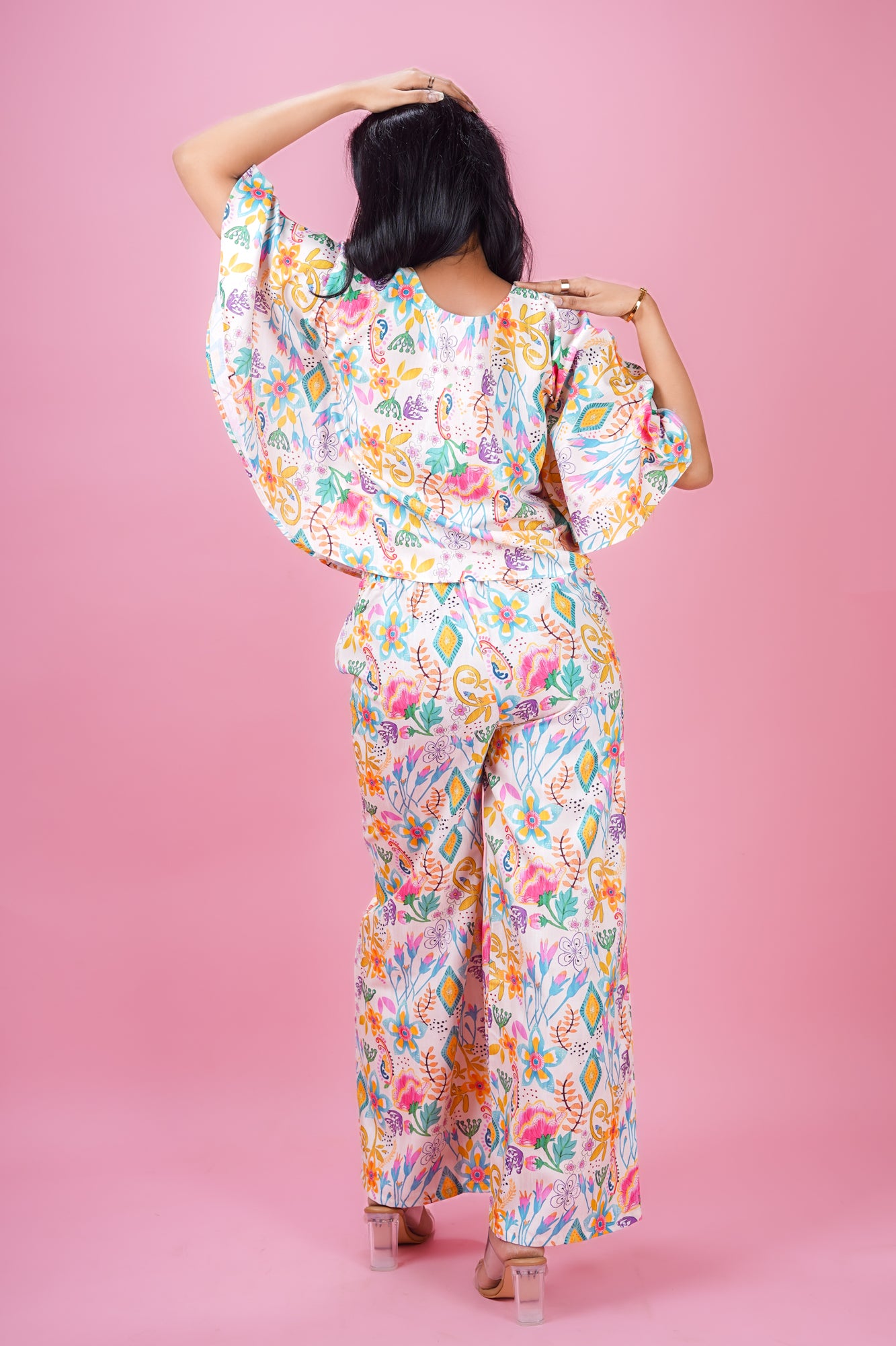 This elegant set features an ivory cap sleeve top with a classic round neck and delicate uneven floral print, made from soft Cotton blend for a gentle machine wash care. The waist-length top pairs beautifully with matching ivory palazzo pants showcasing the same floral uneven print. The pants are full length with a comfortable half belt half elastic closure, creating a harmonious and graceful outfit perfect for both occasional and regular wear.