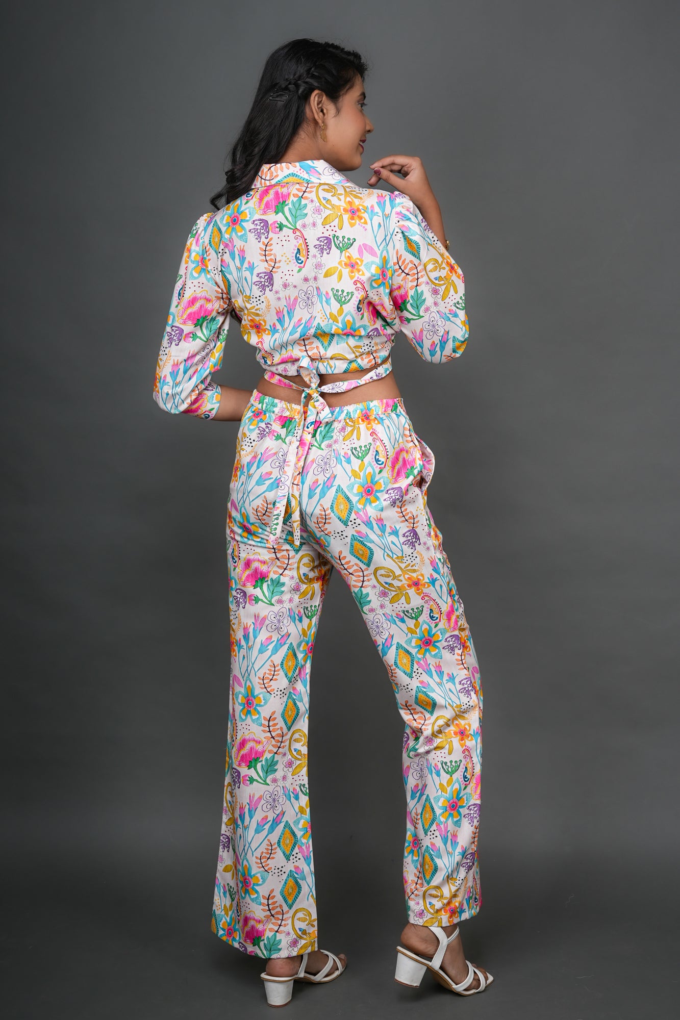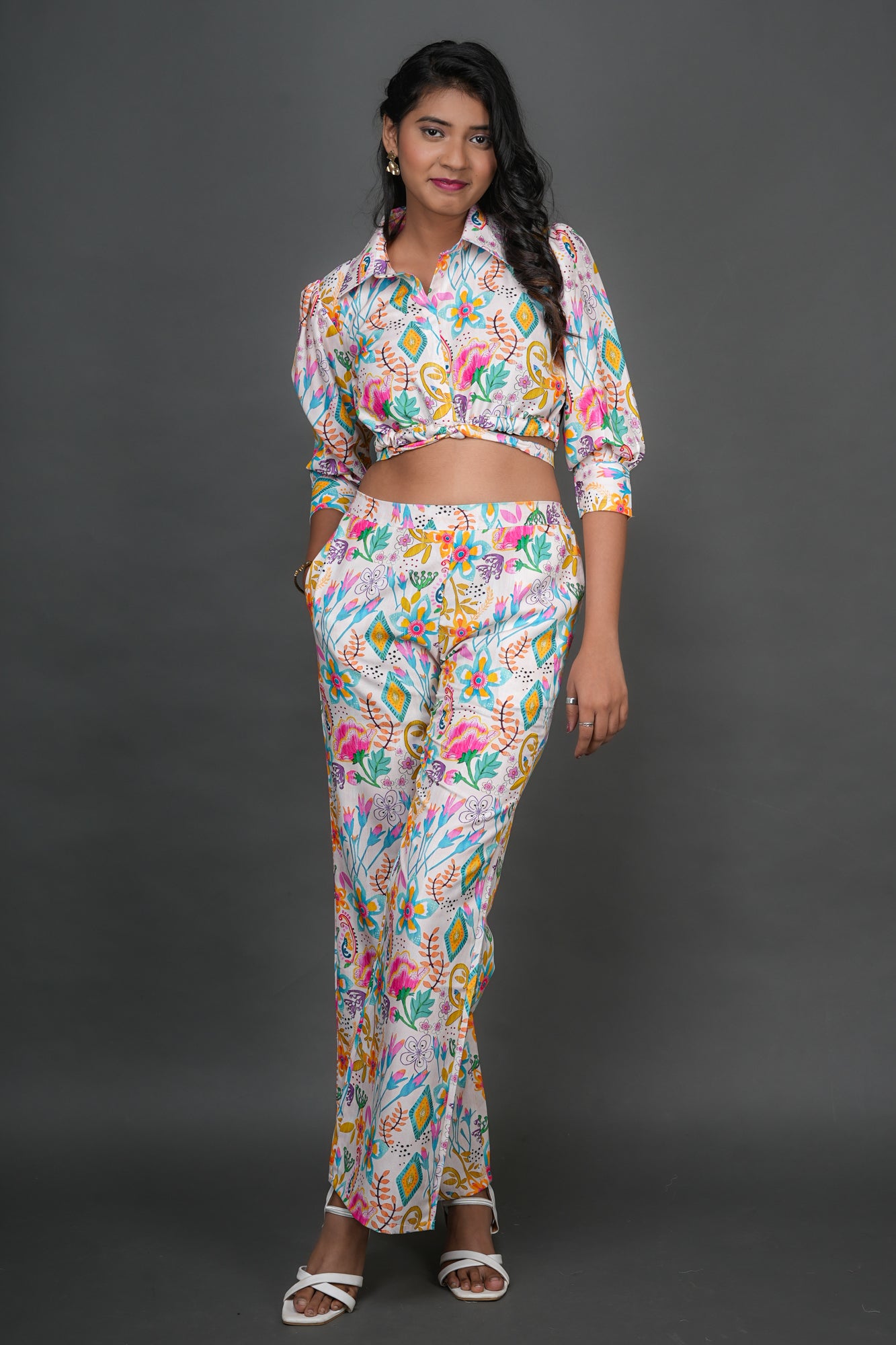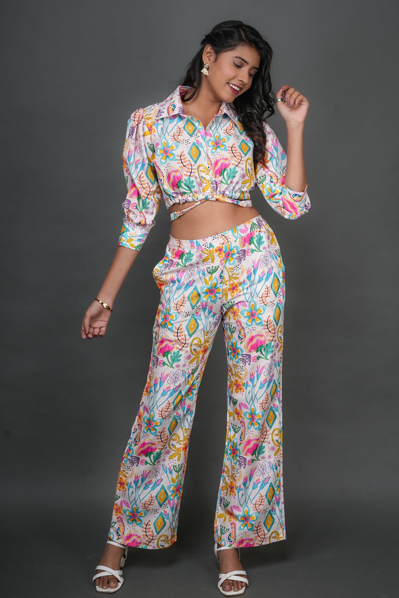 The coordinating ivory palazzo pants feature the same delicate floral print and come with a half-belt, half-elastic waistband for a comfortable and flattering fit. Crafted from cotton blend digital print, this set combines style and comfort for any occasion.