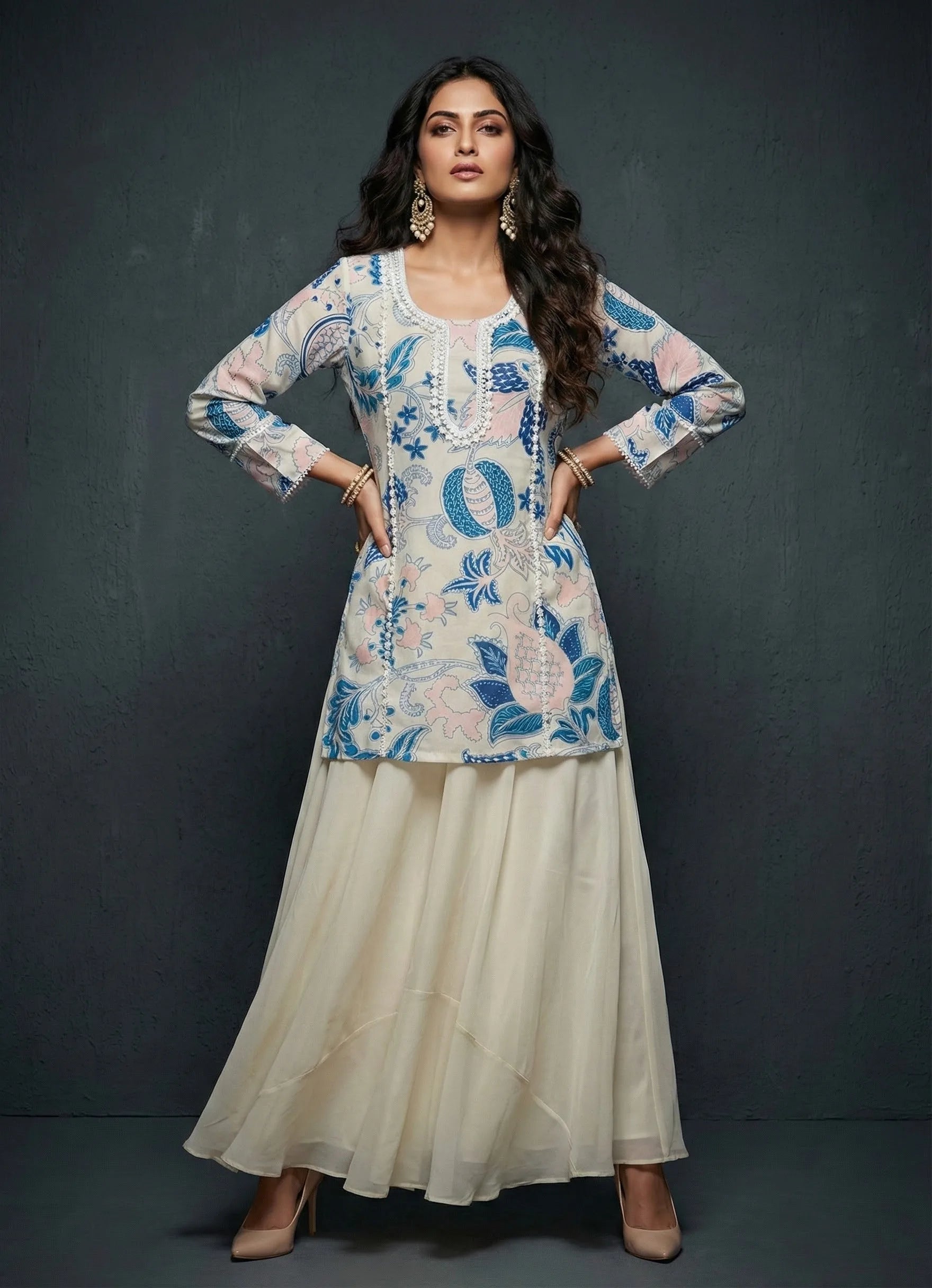 Styling:short kurti with lace hilight sleeves neck & Georgette flare pant with dupatta